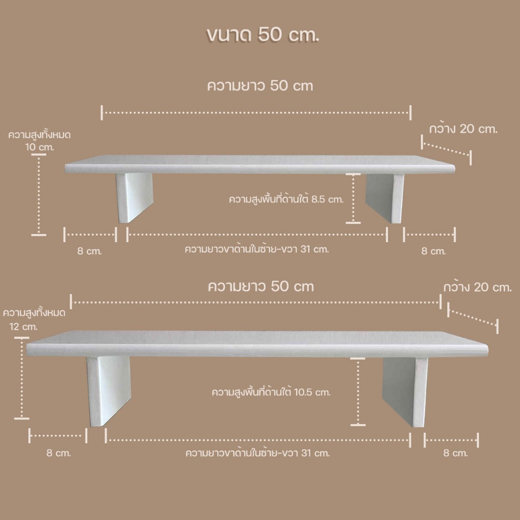 ขนาด กว้าง 20cm.ยาว 50 / 65 / 85 / 100cm.สูง10และ12cm.