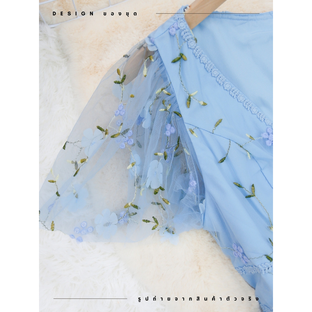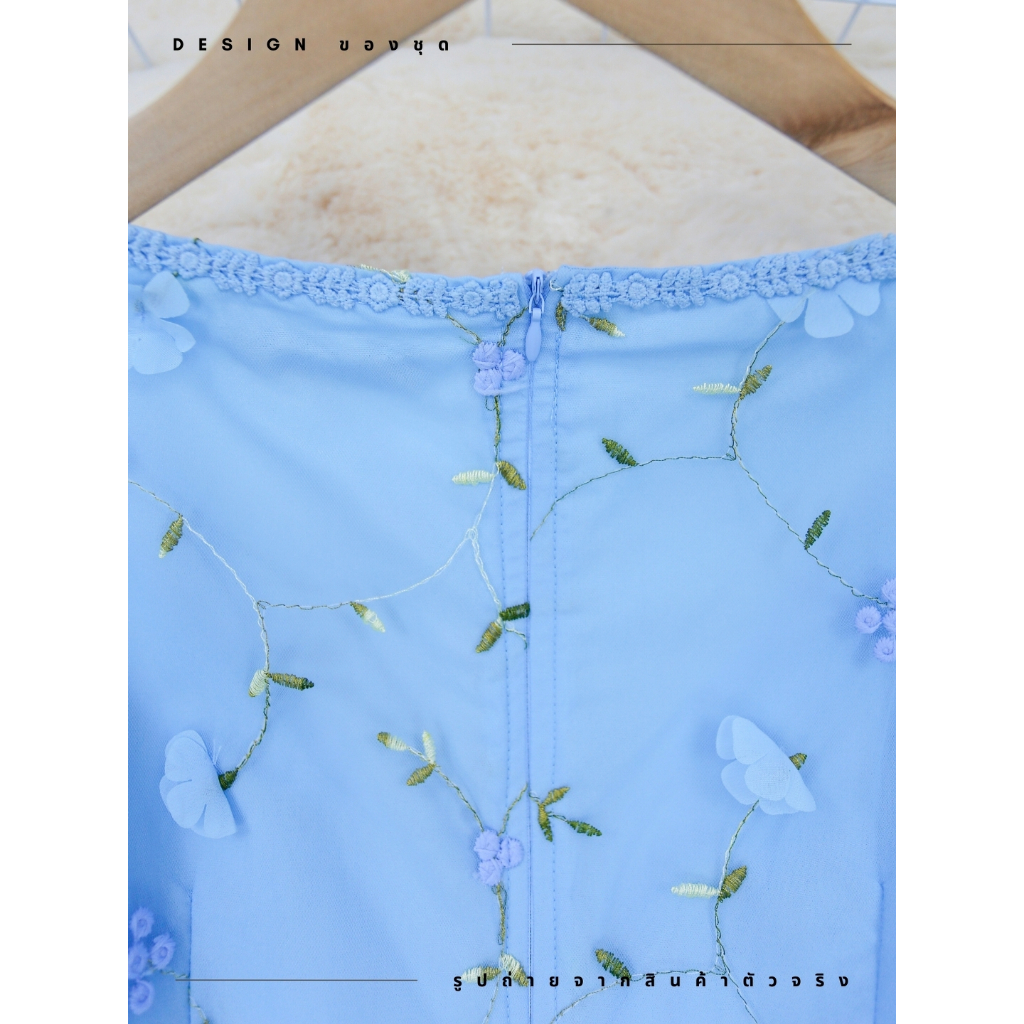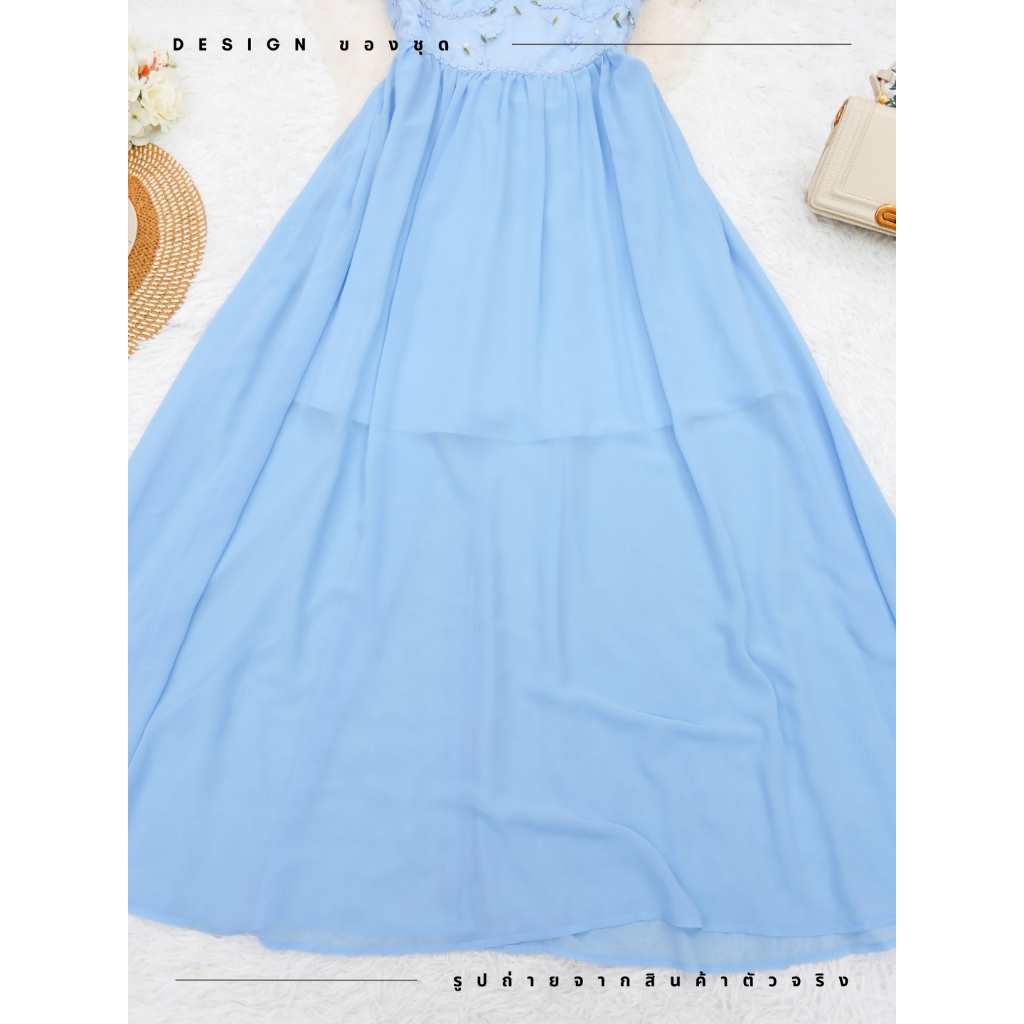 หยิบใส่ตะกร้าชุดเดรสยาวแขนซีทรูปักดอกไม้ลุคคุณหนู สีฟ้า ผ้าชีฟองผสมออร์แกนซ่า