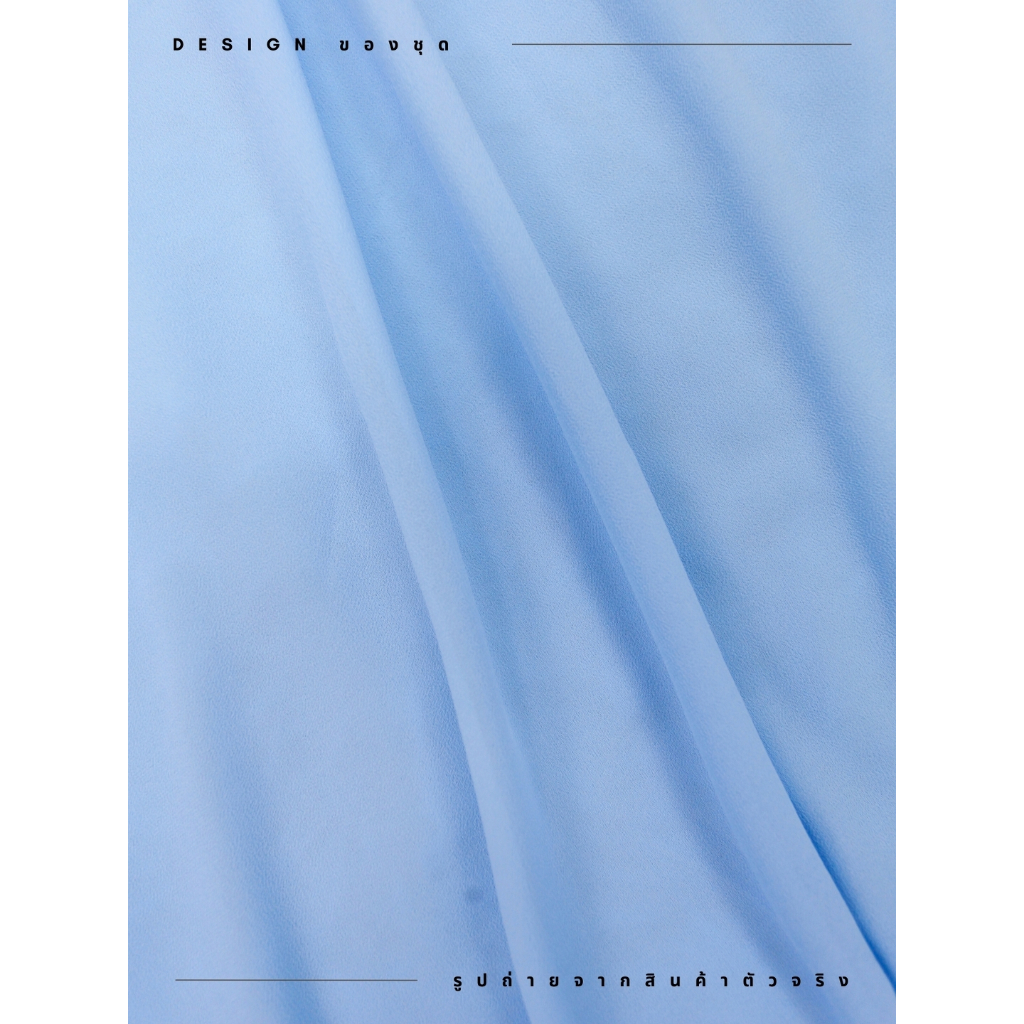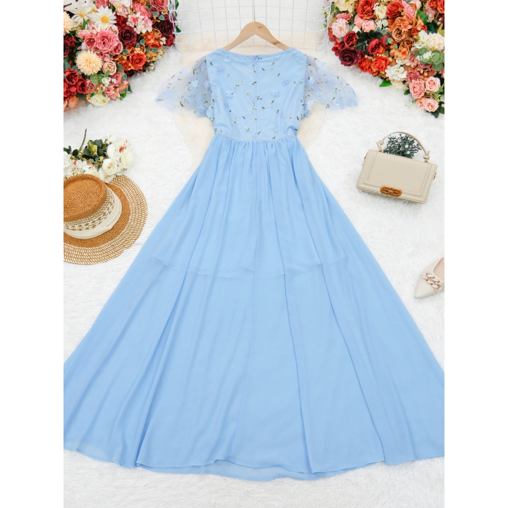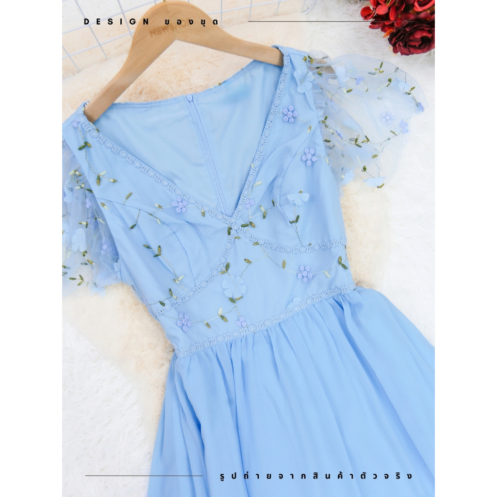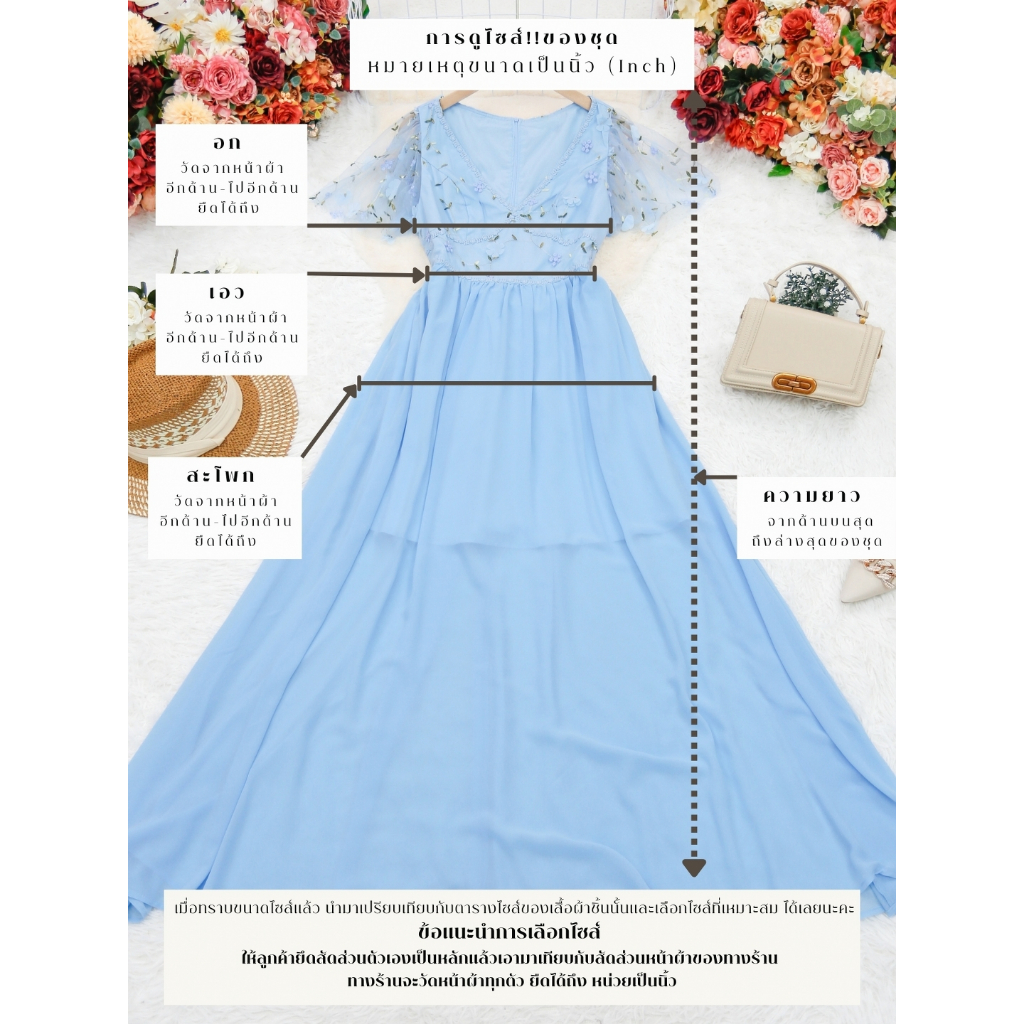 หยิบใส่ตะกร้าชุดเดรสยาวแขนซีทรูปักดอกไม้ลุคคุณหนู สีฟ้า ผ้าชีฟองผสมออร์แกนซ่า