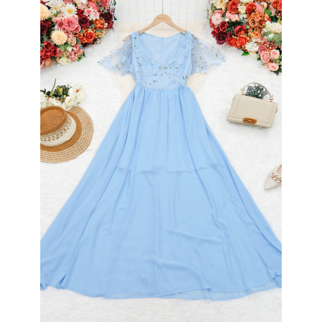 ชุดเดรสยาวแขนซีทรูปักดอกไม้ลุคคุณหนู สีฟ้า ผ้าชีฟองผสมออร์แกนซ่า