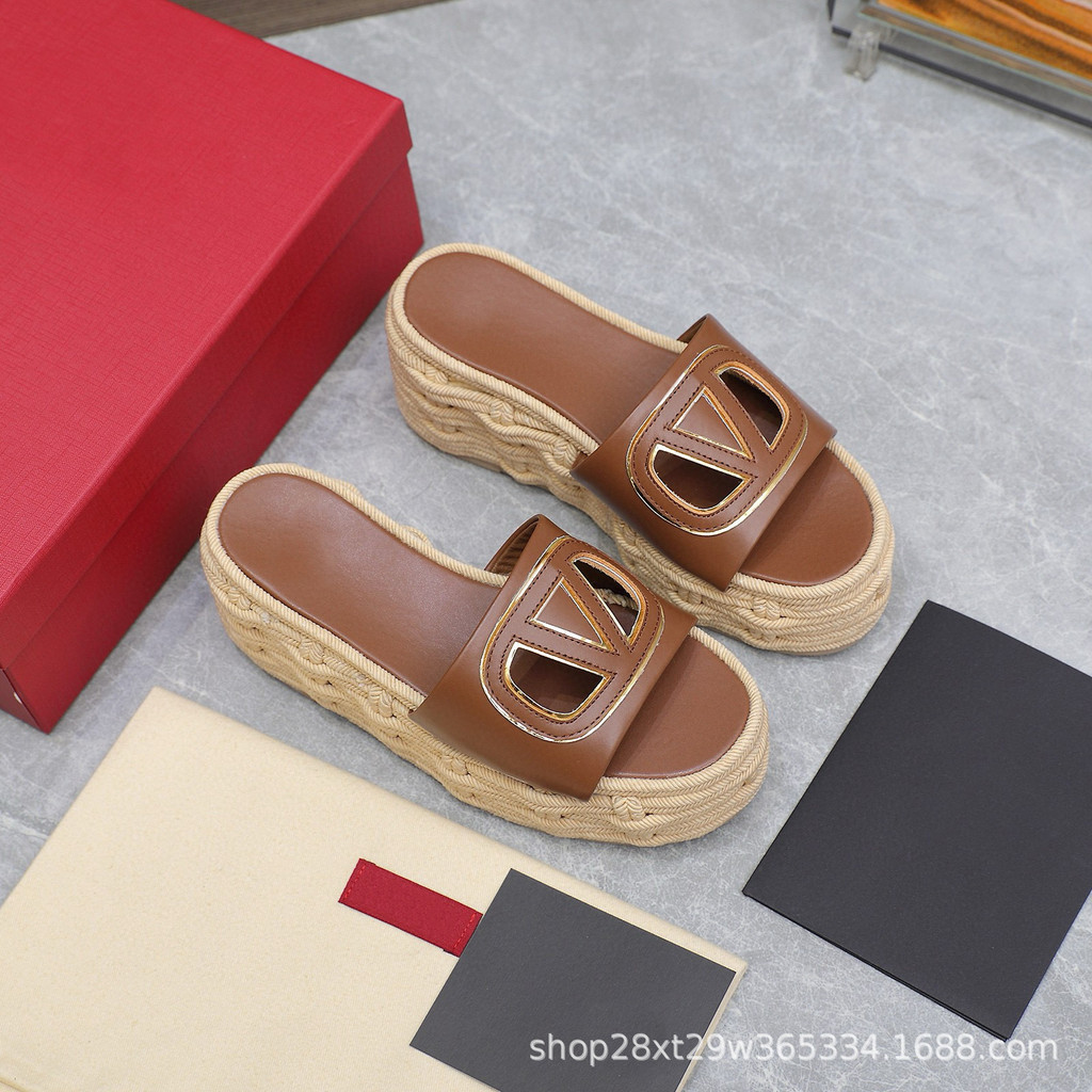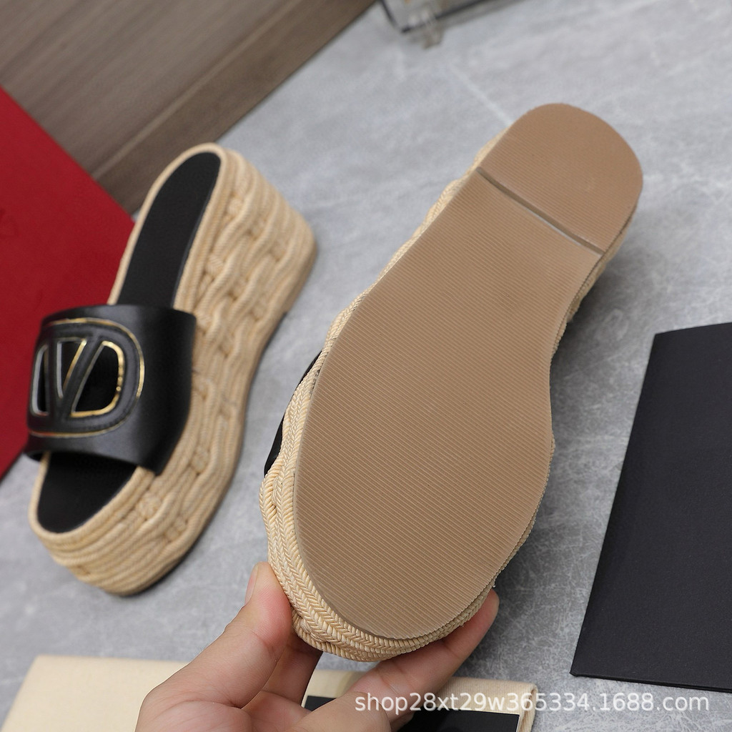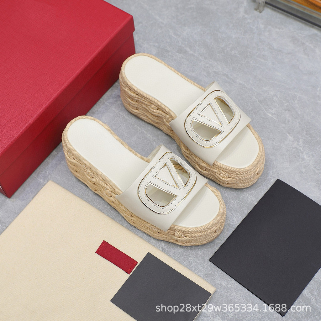 รองเท้าแตะหนังแท้แบบส้นสูงเชือกป่าน 2025 รองเท้าแตะใหม่พื้นรองเท้าทอรองเท้าแตะกลางแจ้งรองเท้าแตะเพิ่มความสูงพื้นหนาสำหรับผู้หญิงรองเท้าแตะสายเดียวหัวเข็มขัดรองเท้าแตะสายเดียว V ฤดูร้อนพื้นหนา