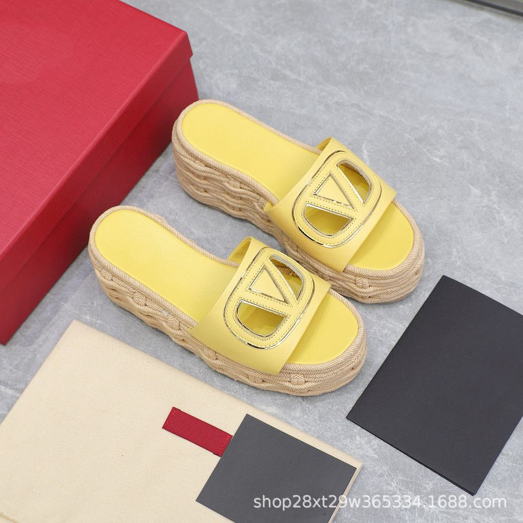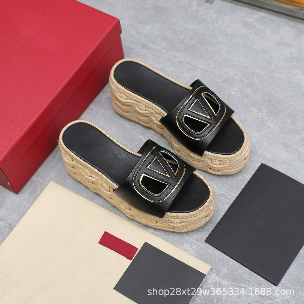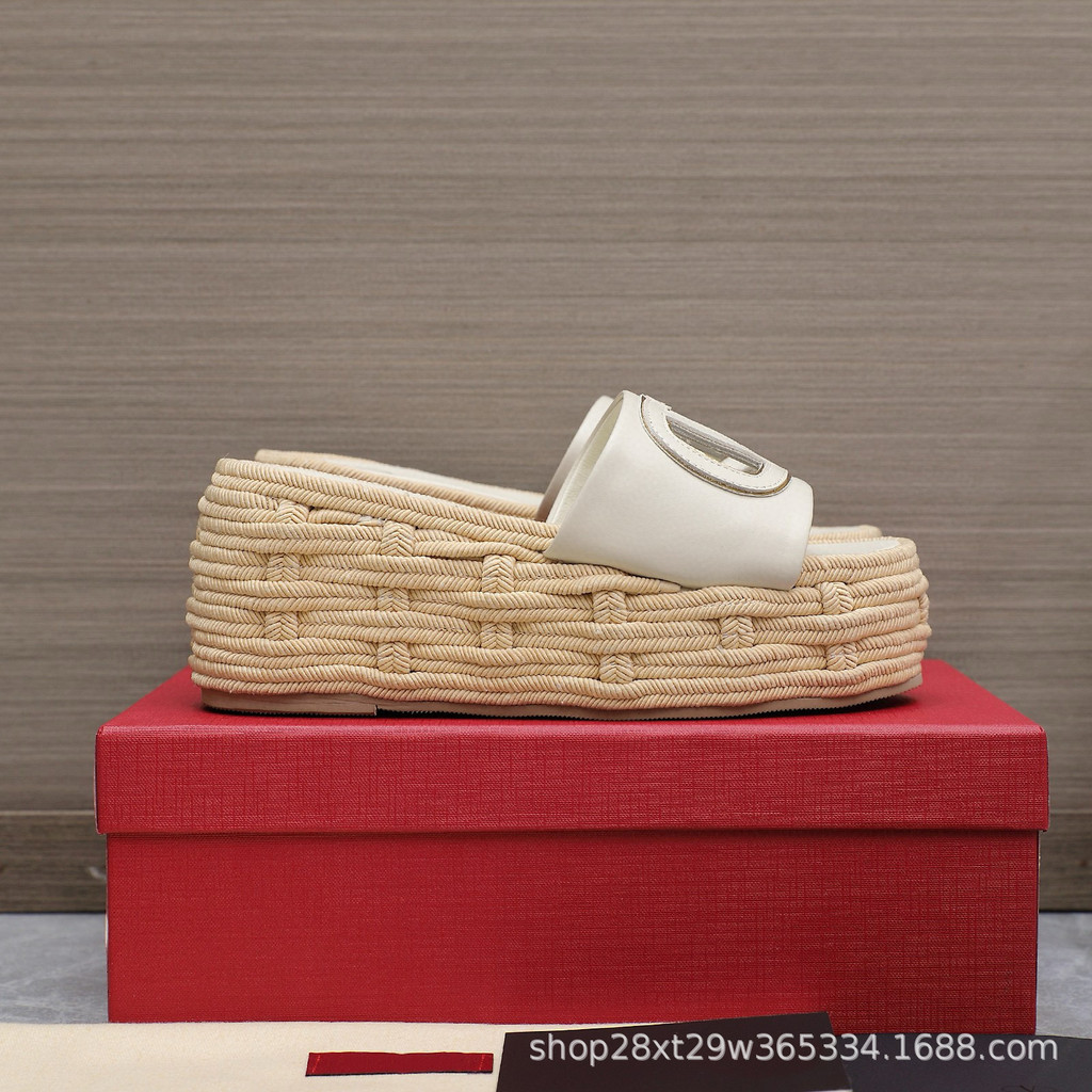 รองเท้าแตะหนังแท้แบบส้นสูงเชือกป่าน 2025 รองเท้าแตะใหม่พื้นรองเท้าทอรองเท้าแตะกลางแจ้งรองเท้าแตะเพิ่มความสูงพื้นหนาสำหรับผู้หญิงรองเท้าแตะสายเดียวหัวเข็มขัดรองเท้าแตะสายเดียว V ฤดูร้อนพื้นหนา