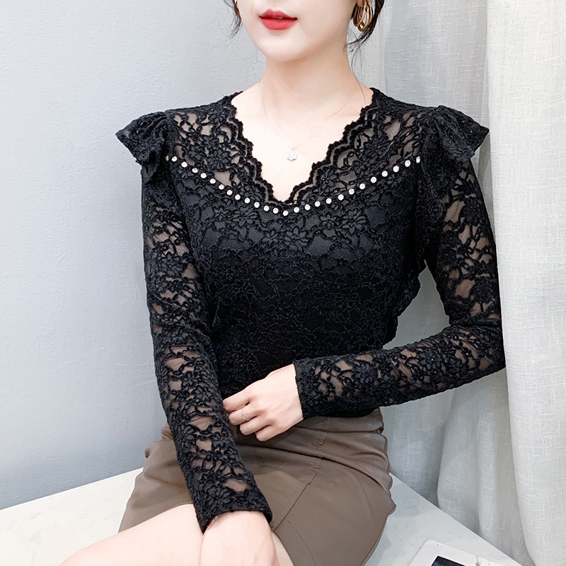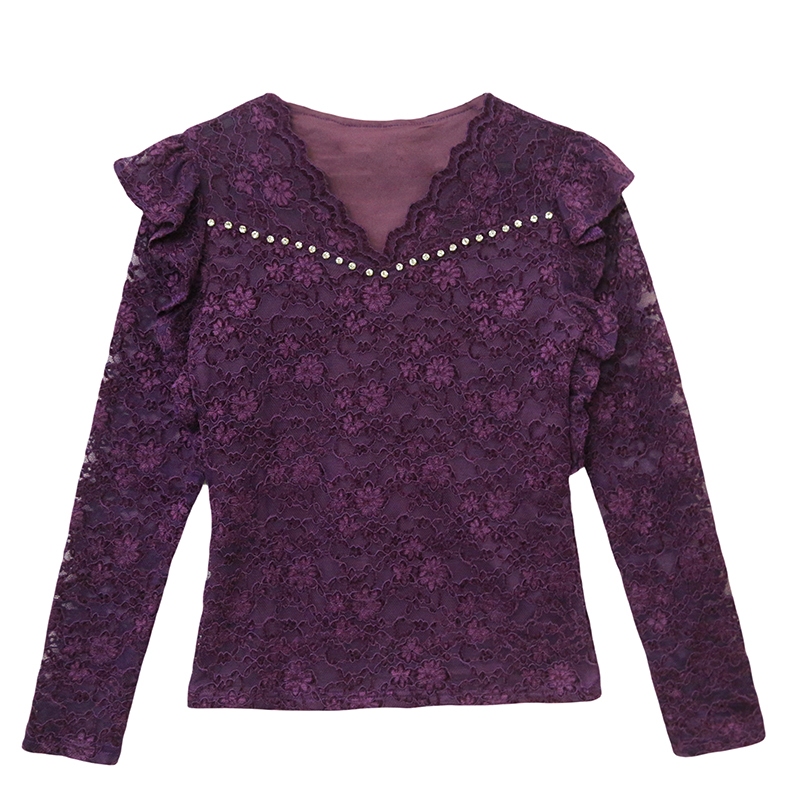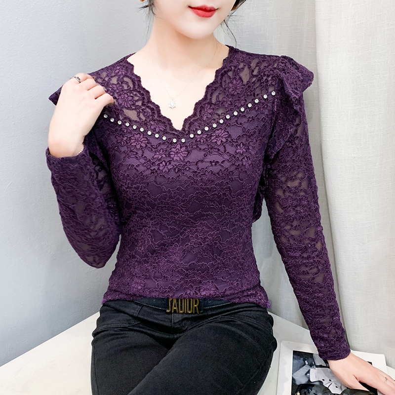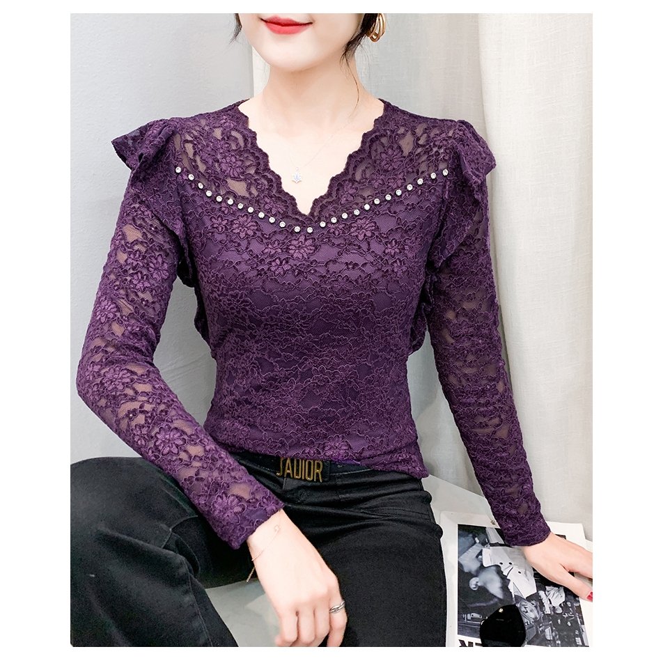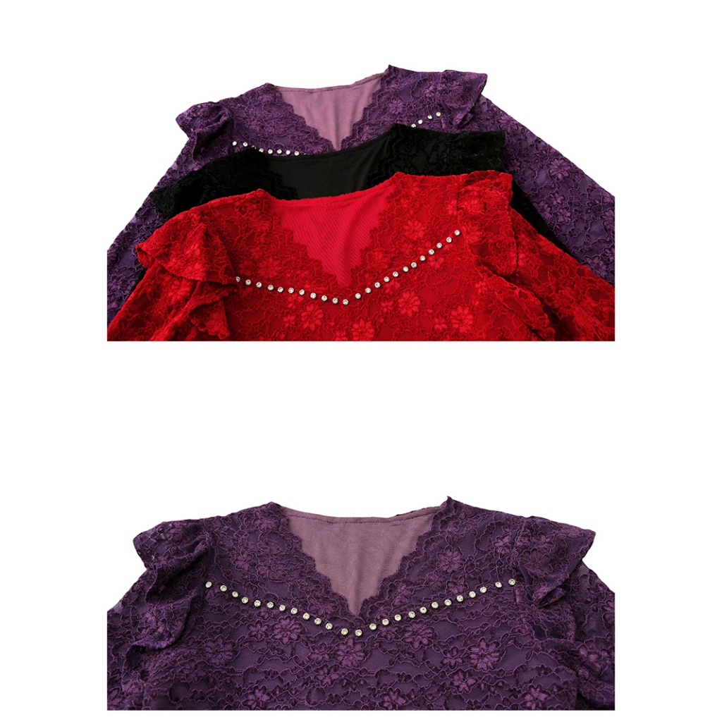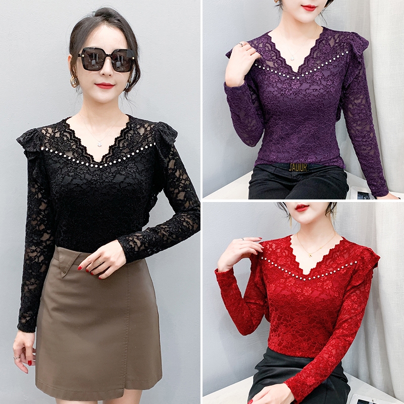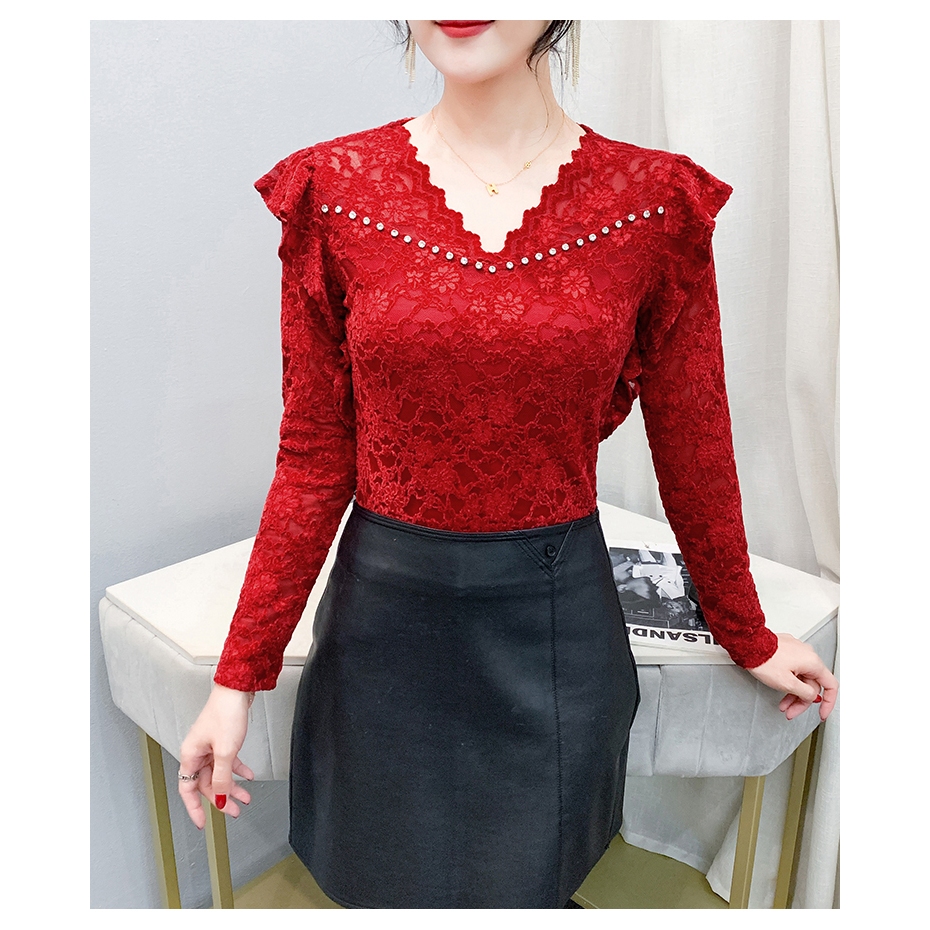 เสื้อลูกไม้แขนยาวสำหรับผู้หญิง สไตล์ตะวันตก ออกแบบเพื่อความกระชับ โวลต์ ลายลูกปัด สีแดงด้านบน