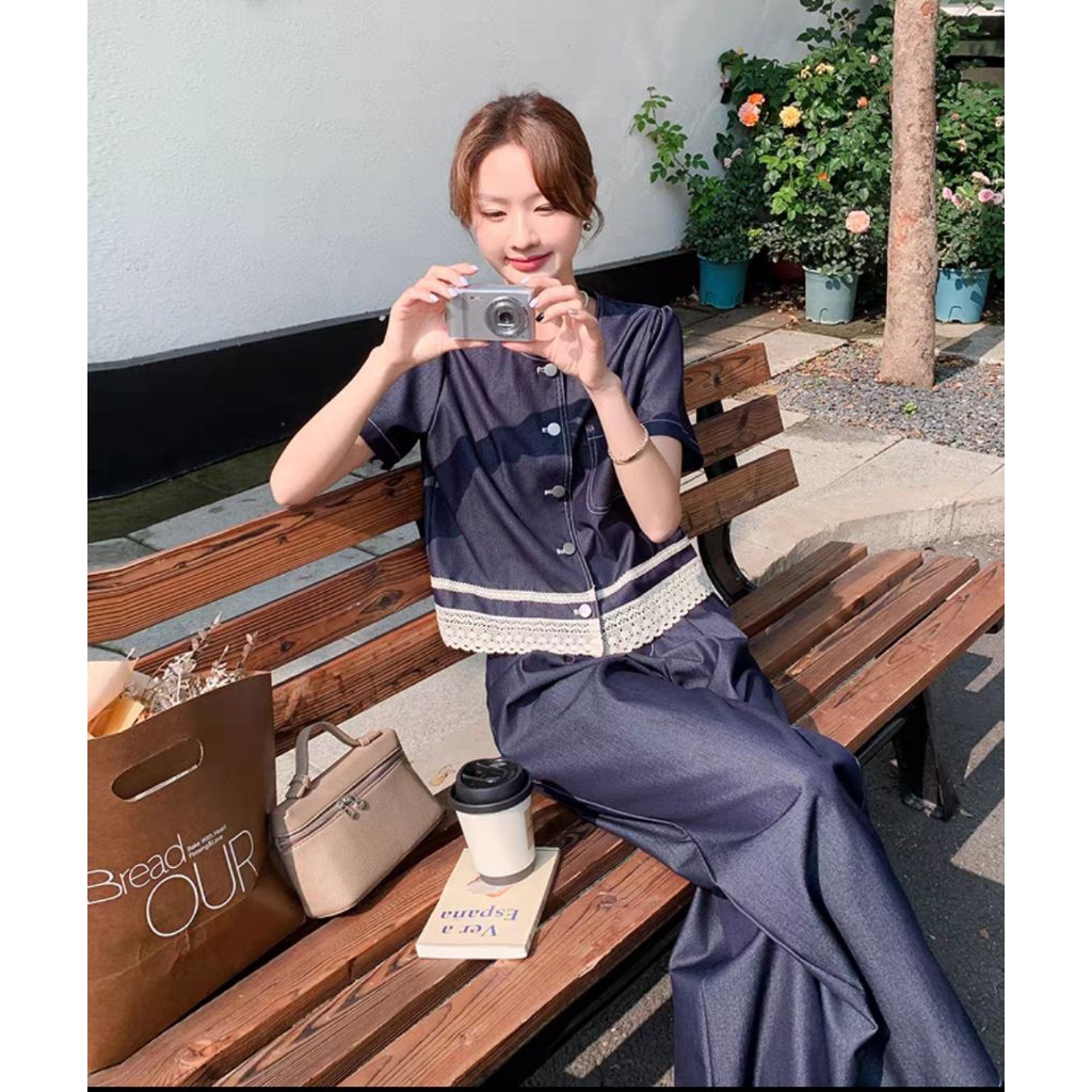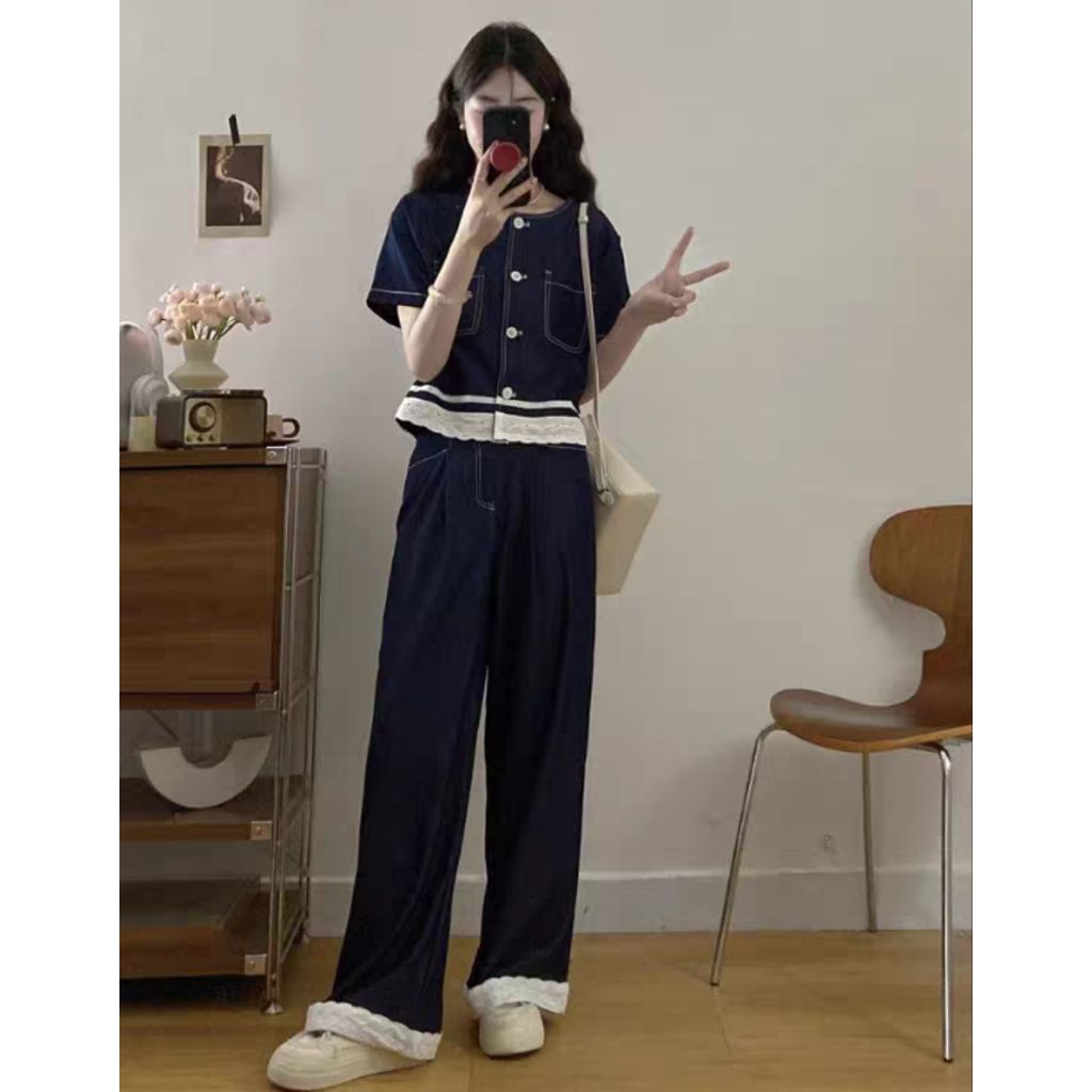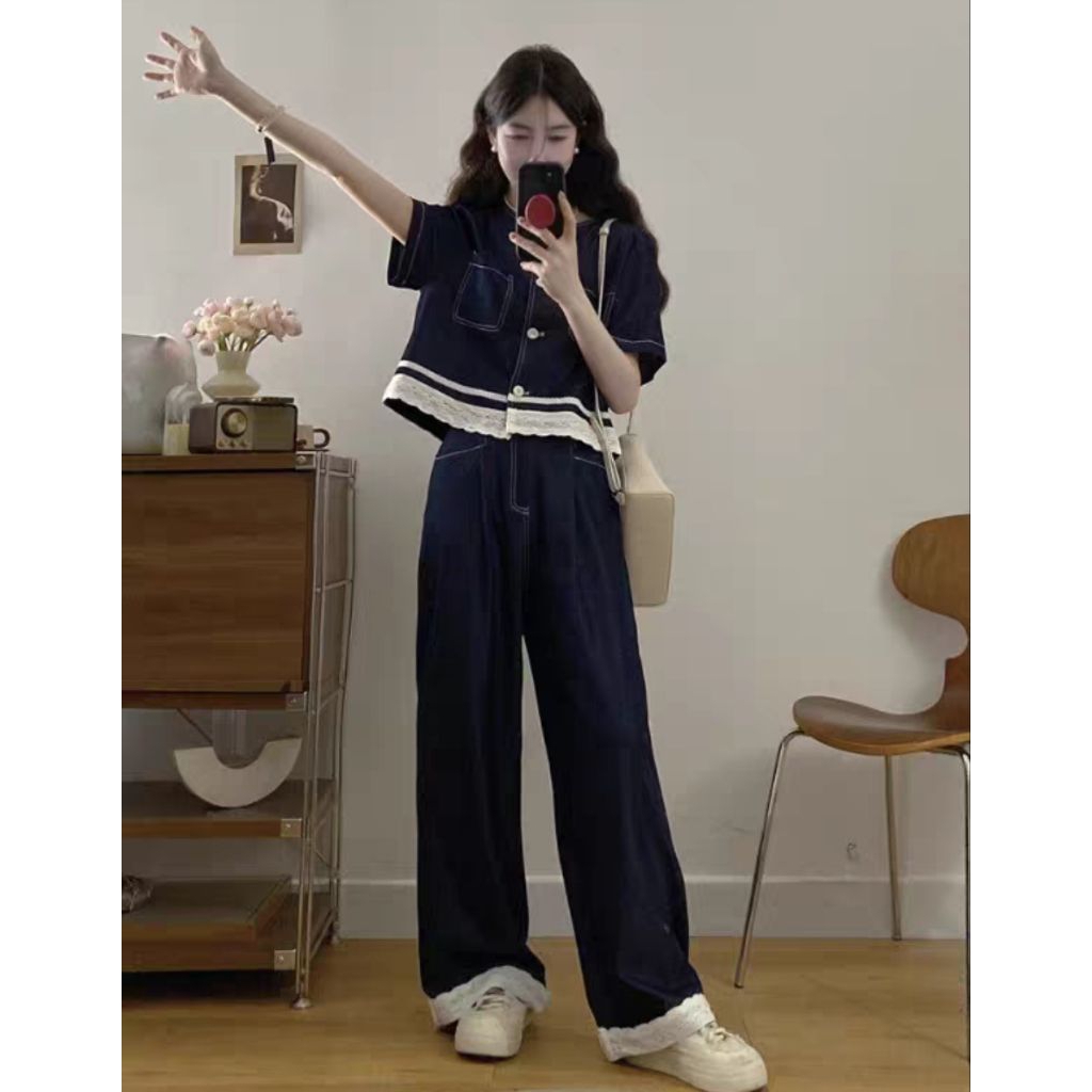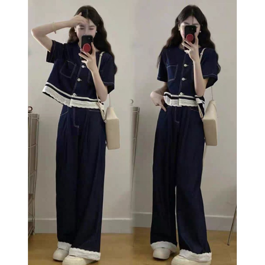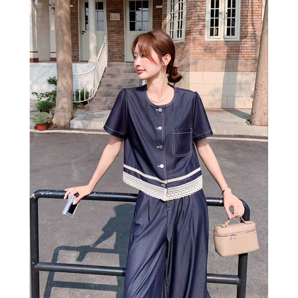 ชุดเซ็ท 2ชิ้น ( คล้ายงานยีนส์ )บางเบาตกแต่งลูกไม้ สวมใส่สบายในหน้าร้อน ดีไซน์ช่วยพรางหุ่นให้ดูเพรียว มีเสน่ห์ พร้อมกางเกงเก้าส่วน เข้าชุดกันอย่างมีสไตล์