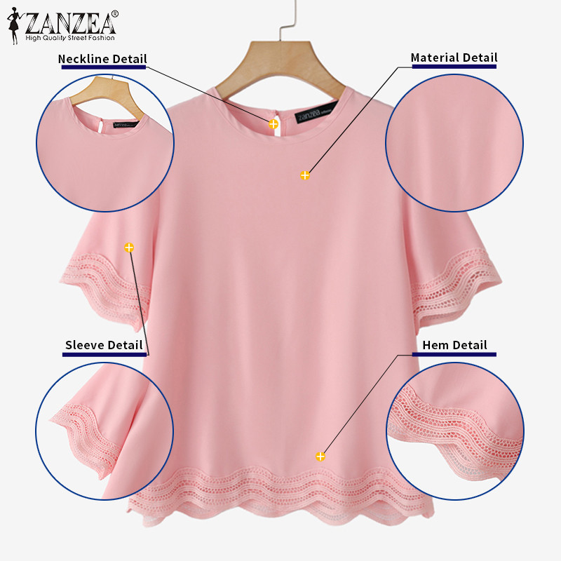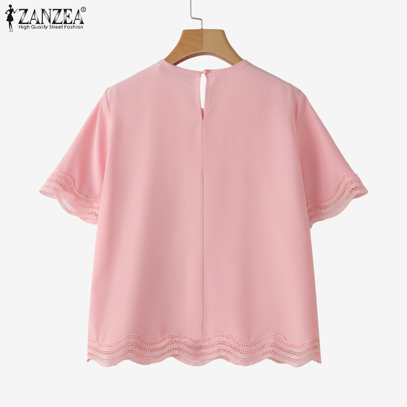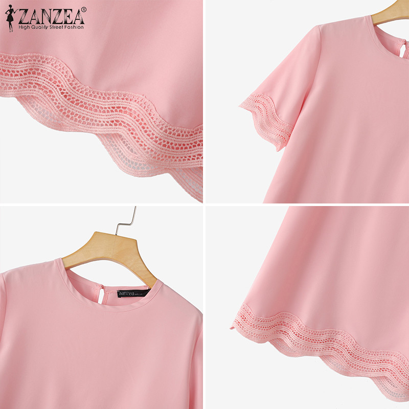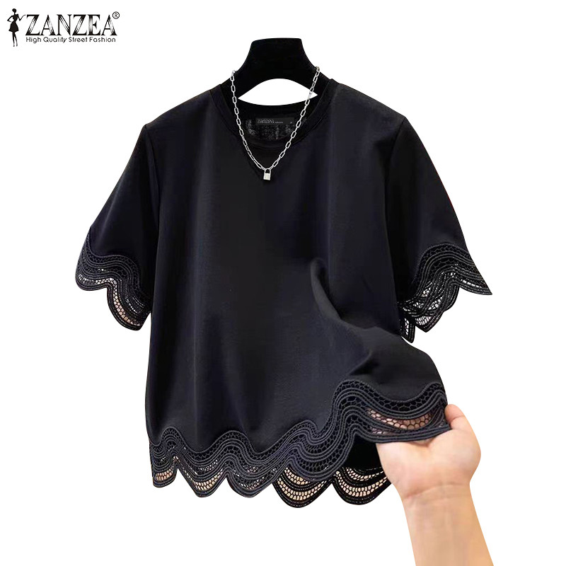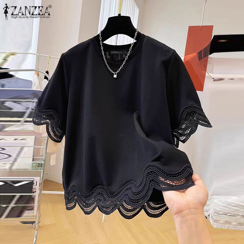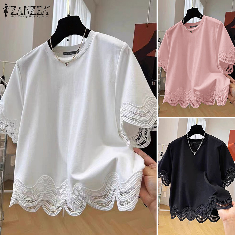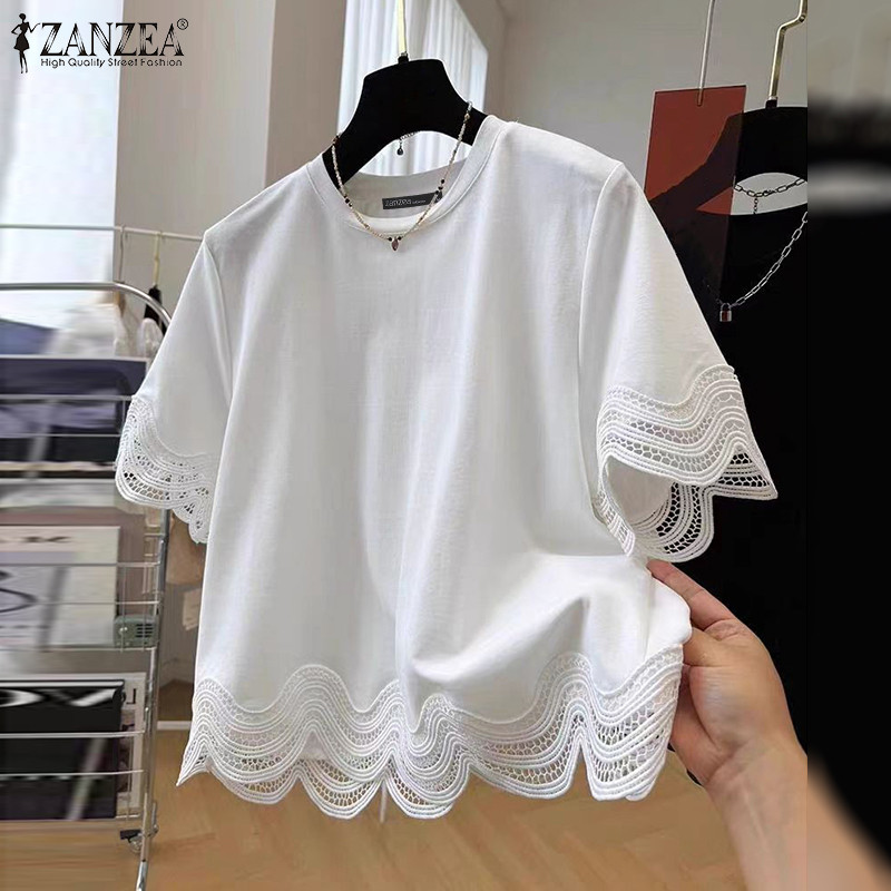 ZANZEA ผู้หญิงเกาหลีลําลองรอบคอ Splicing ลูกไม้เสื้อแขนสั้นหลวม
