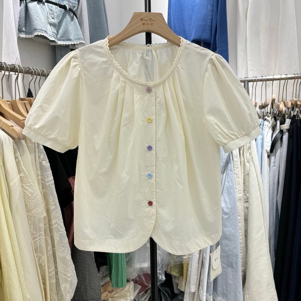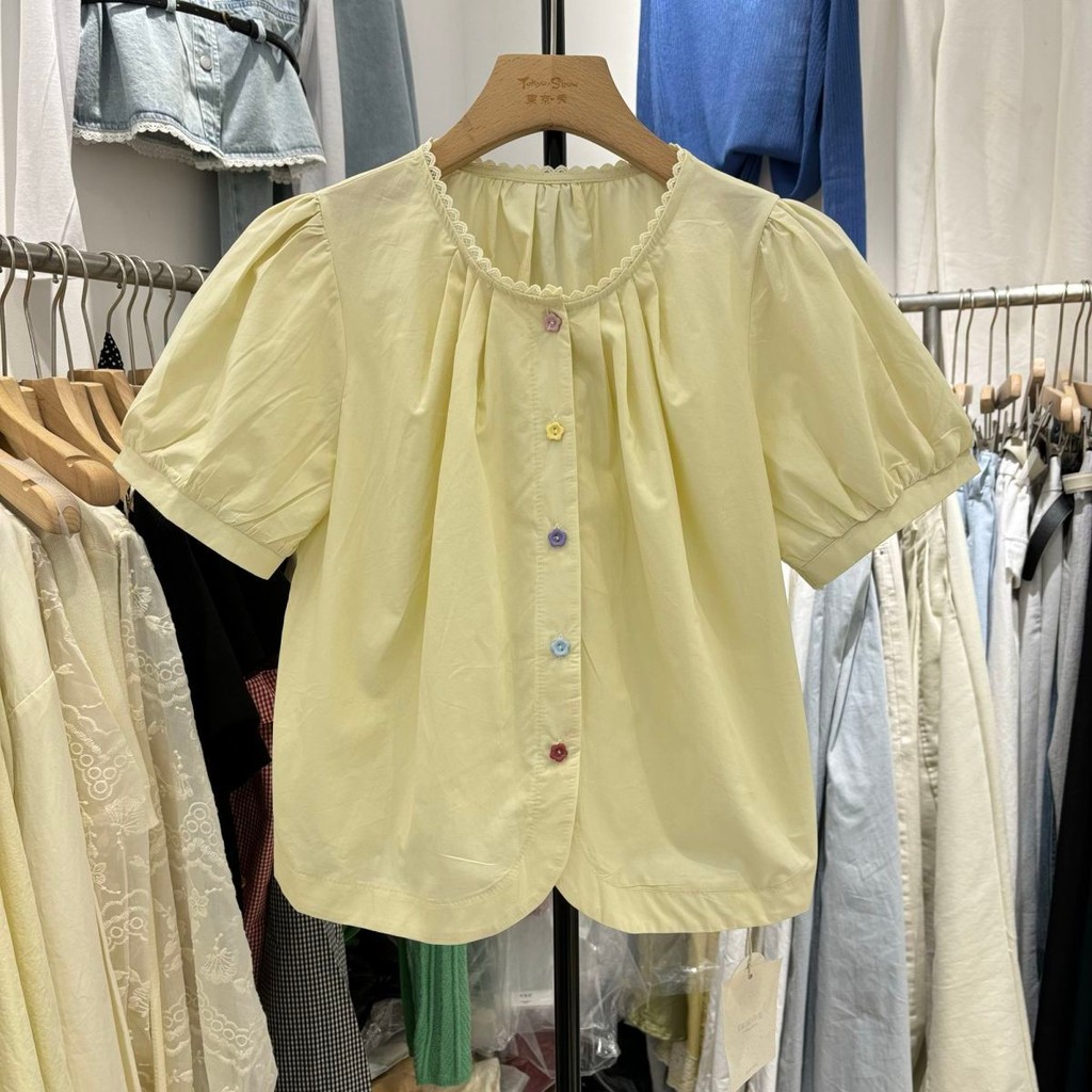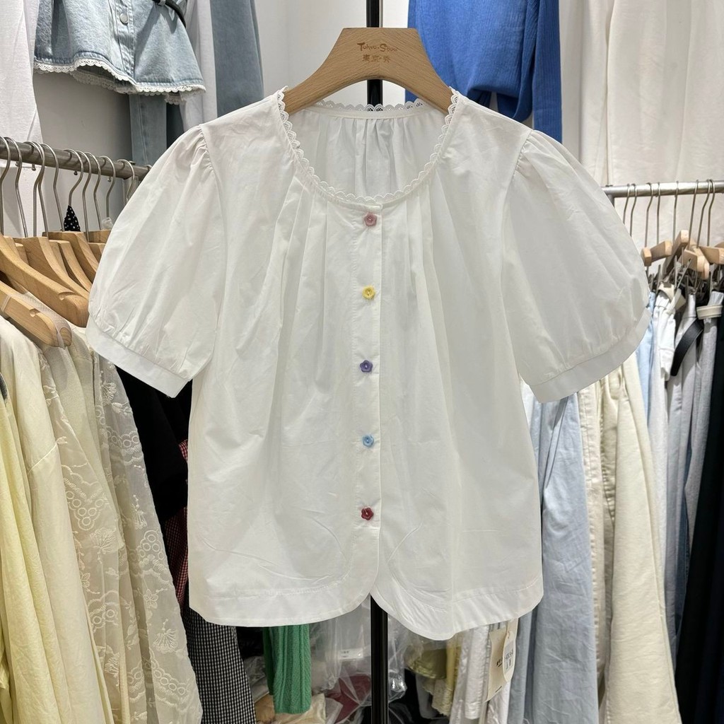 เสื้อเชิ้ตแขนพัฟปุ่มสีสันสดใส ขนาดเล็ก ผสมผสานสไตล์เกาหลีและฝรั่งเศส