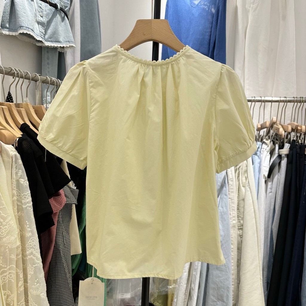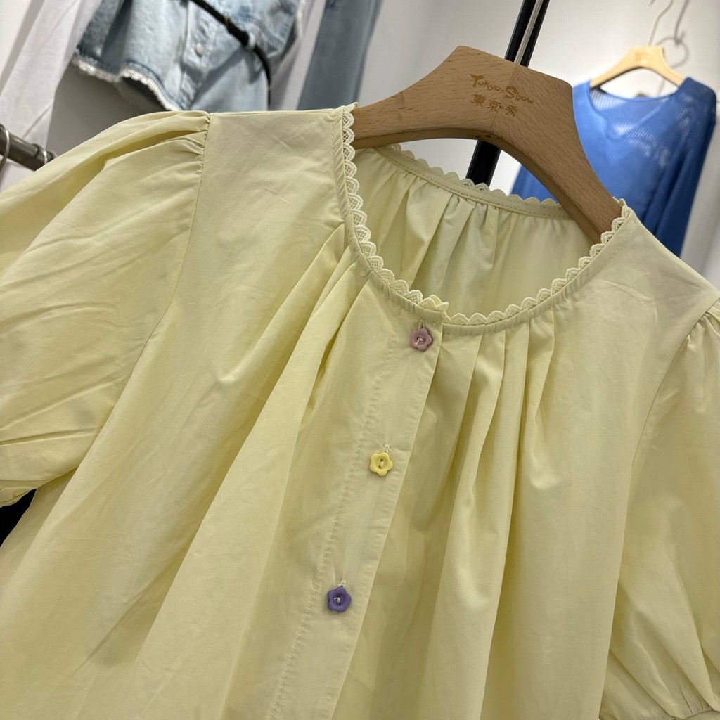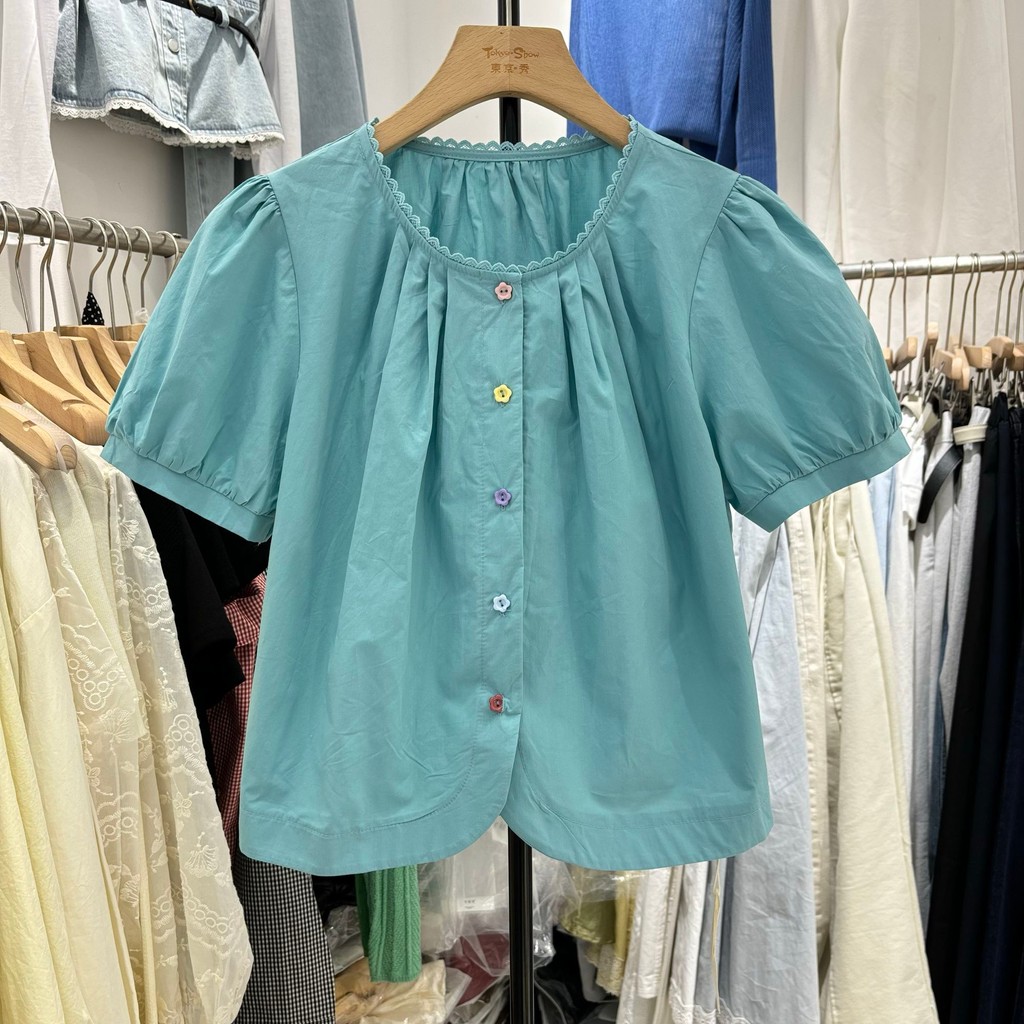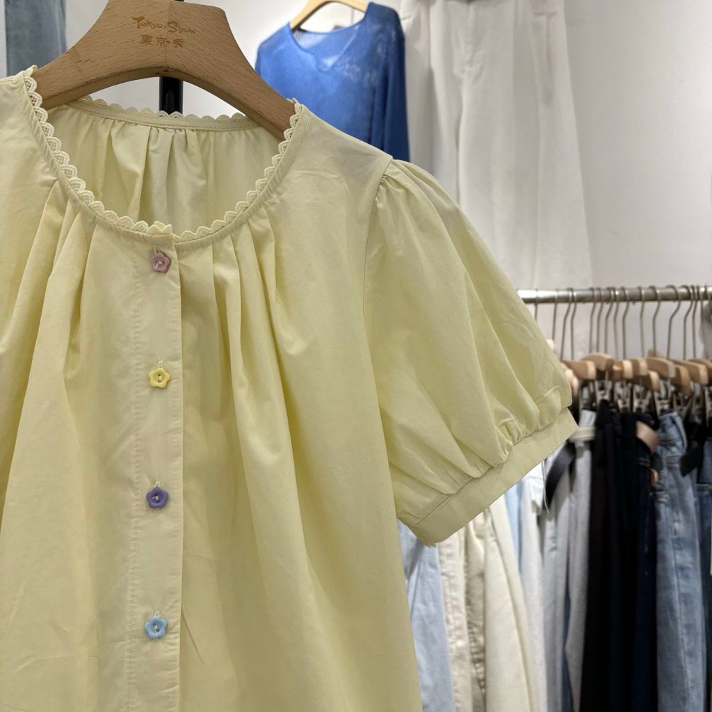 เสื้อเชิ้ตแขนพัฟปุ่มสีสันสดใส ขนาดเล็ก ผสมผสานสไตล์เกาหลีและฝรั่งเศส