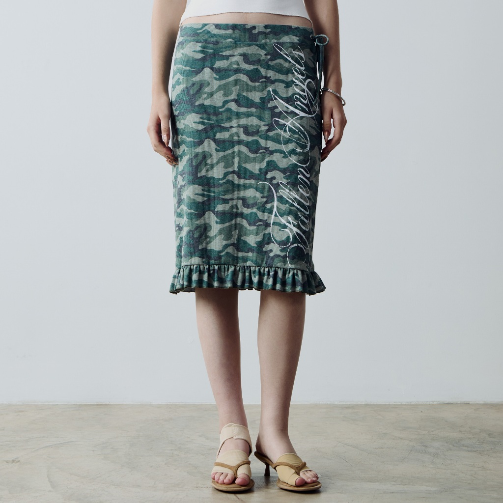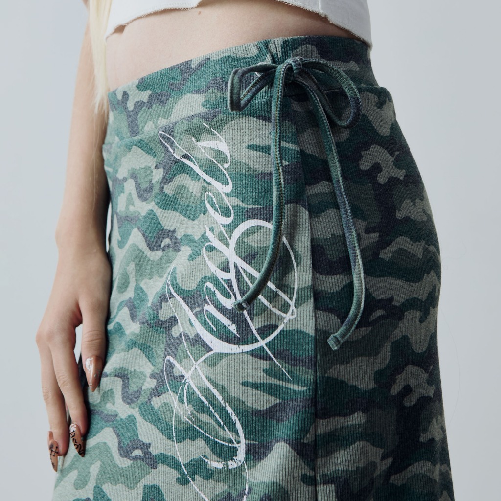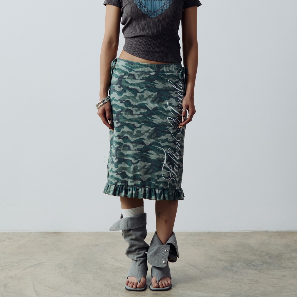 กระโปรงยาวเอวต่ำลาย camouflage ดีเทลฟ้อนแตกๆ สไตล์วินเทจ พร้อมโบว์เล็กสองข้างตรงเอวเพิ่มความน่ารักให้ลุคเท่ๆ ใส่กับเสื้อยืดหรือสายเดี่ยวคือเข้ากันสุดๆ