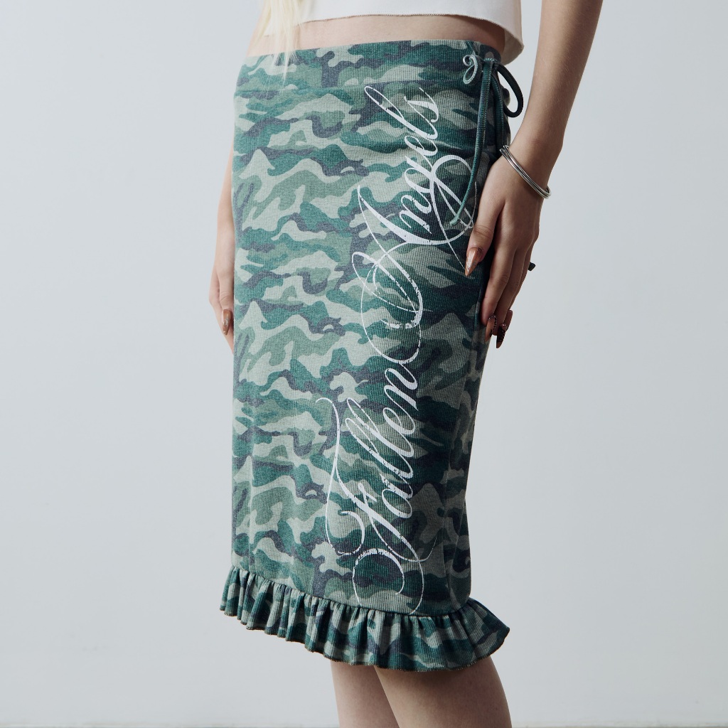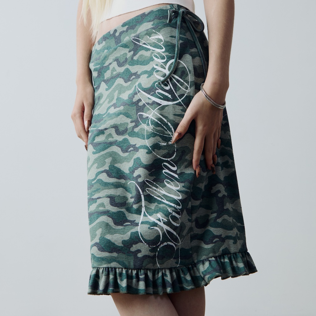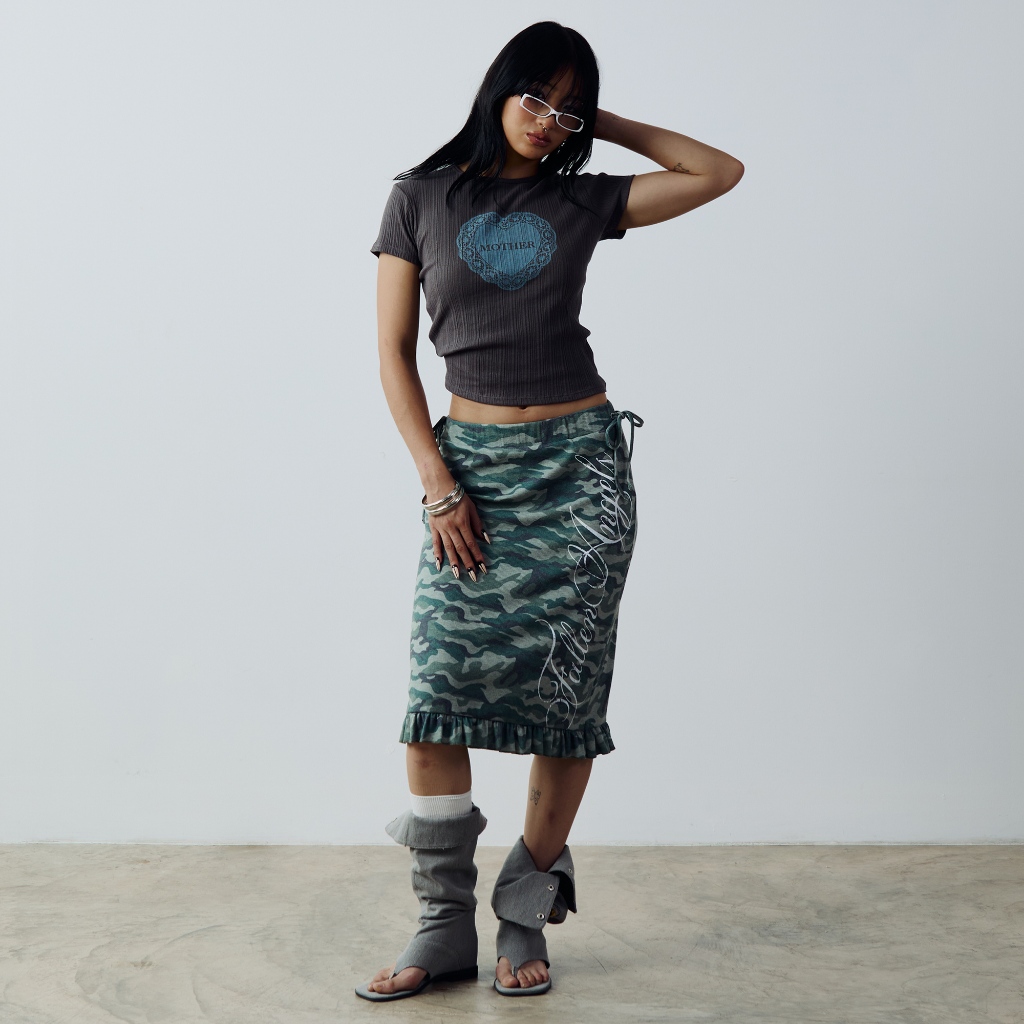 กระโปรงยาวเอวต่ำลาย camouflage ดีเทลฟ้อนแตกๆ สไตล์วินเทจ พร้อมโบว์เล็กสองข้างตรงเอวเพิ่มความน่ารักให้ลุคเท่ๆ ใส่กับเสื้อยืดหรือสายเดี่ยวคือเข้ากันสุดๆ