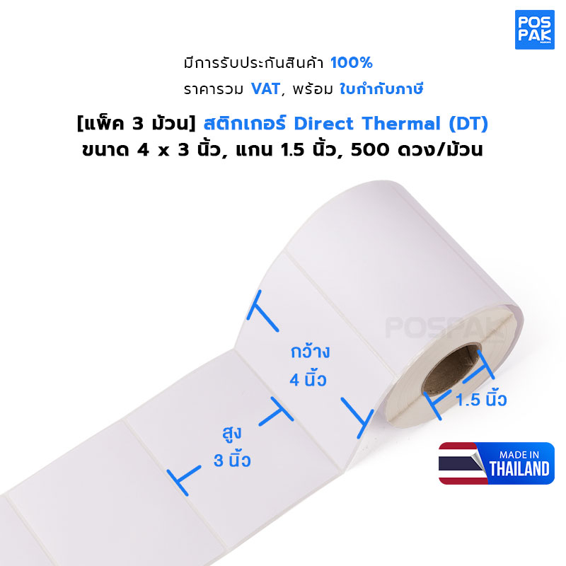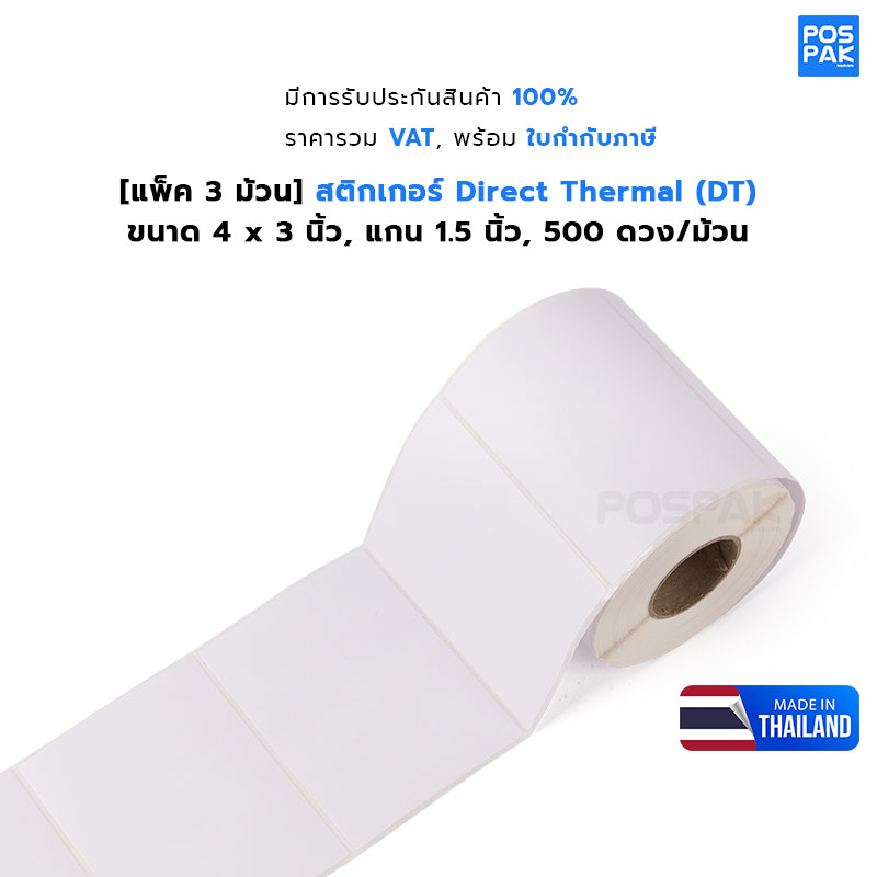 ST.DT 4 x 3 นิ้ว แกน 1.5 นิ้ว 500 ดวง/ม้วน สติกเกอร์บาร์โค้ด DirectThermal (ไม่ใช้หมึก) ผลิตในไทย