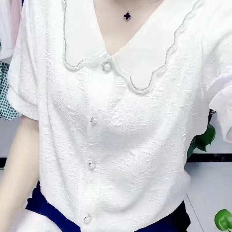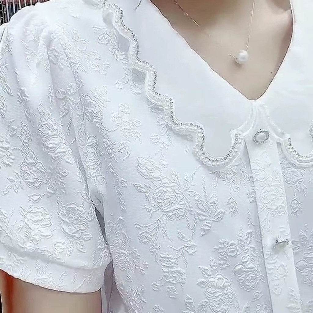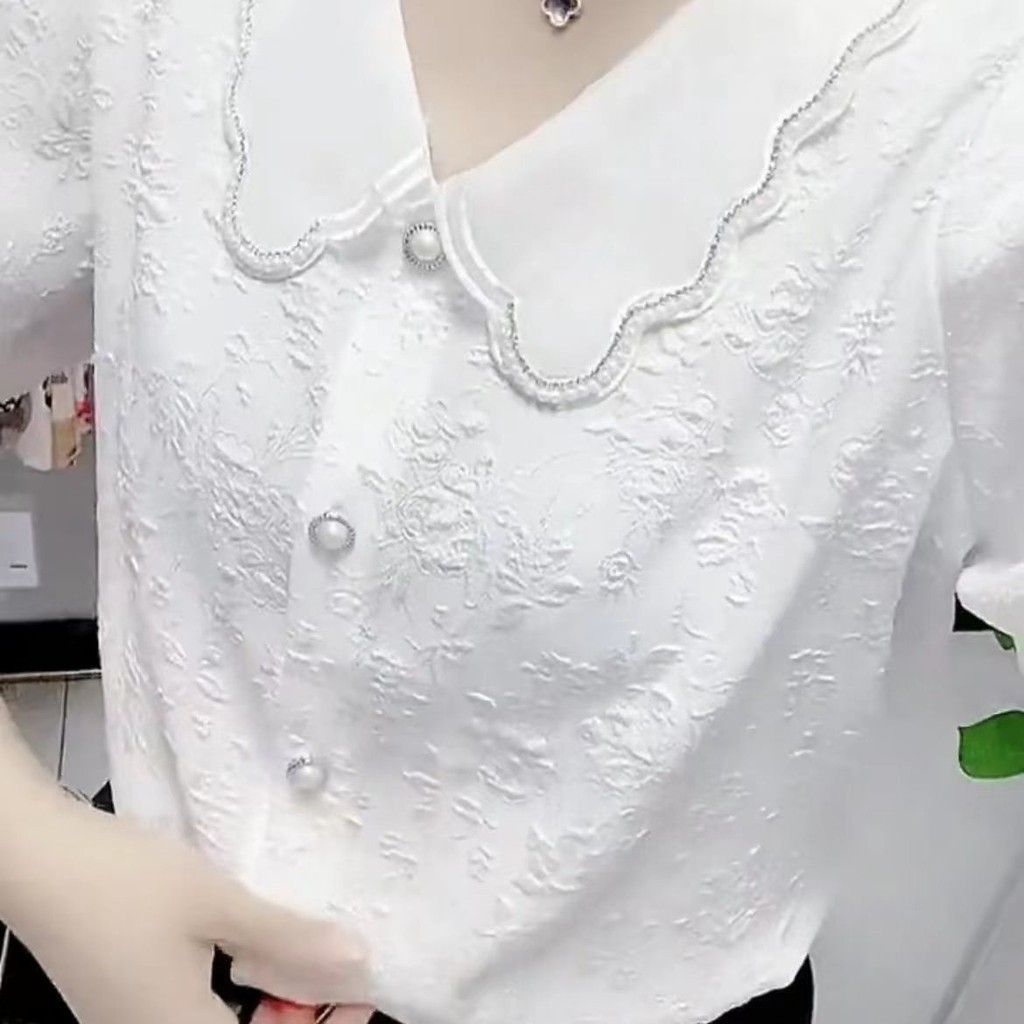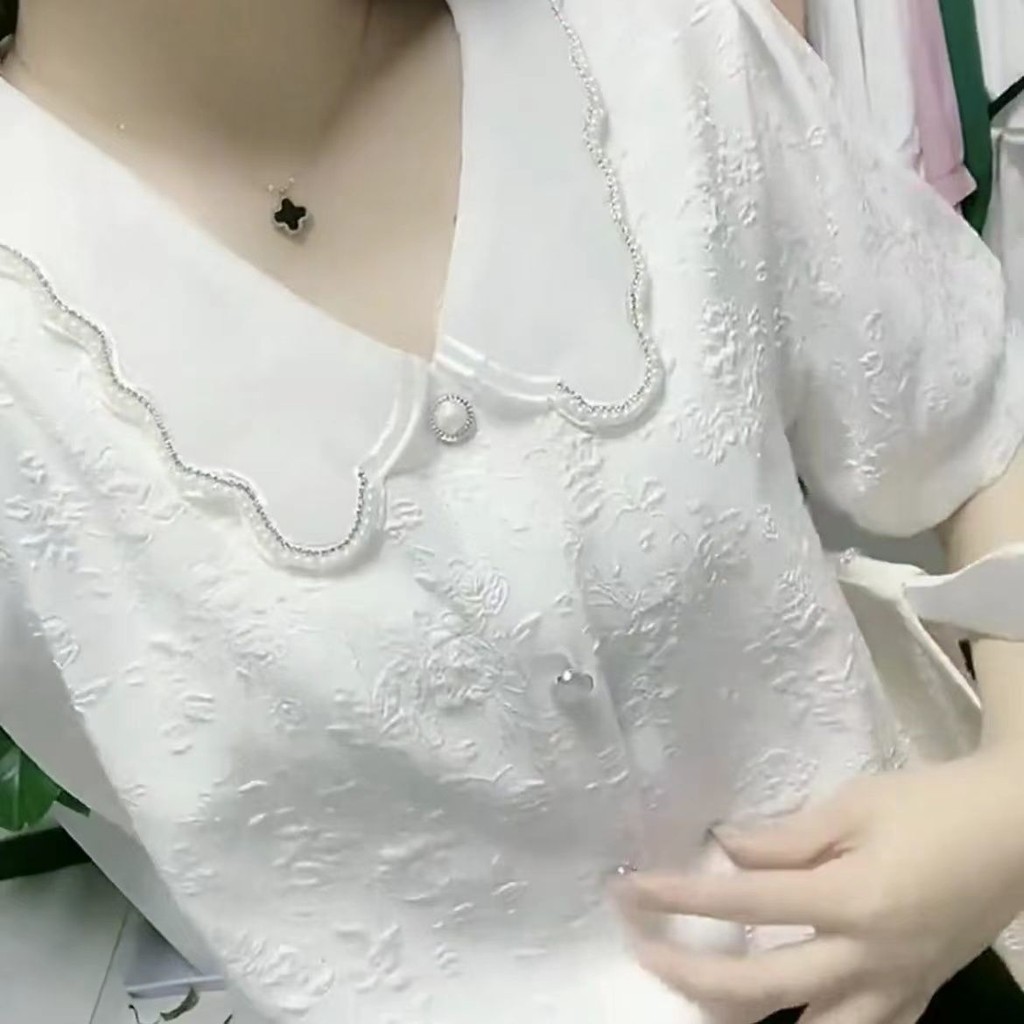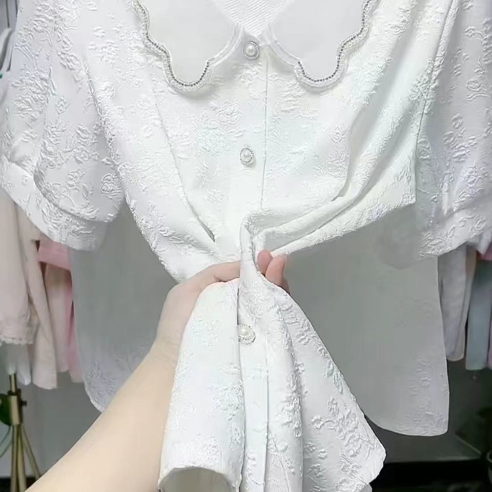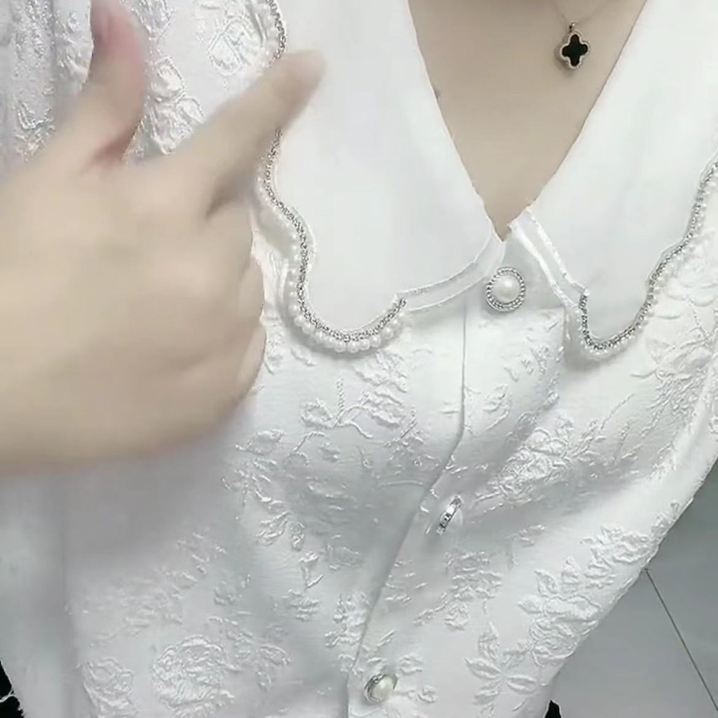 2023 สไตล์ใหม่สดใหม่ เสื้อเบลาส์ลูกปัดสไตล์ฝรั่งเศสแขนกลางจีบแจ็คการ์ด 3D สลิมมิ่ง