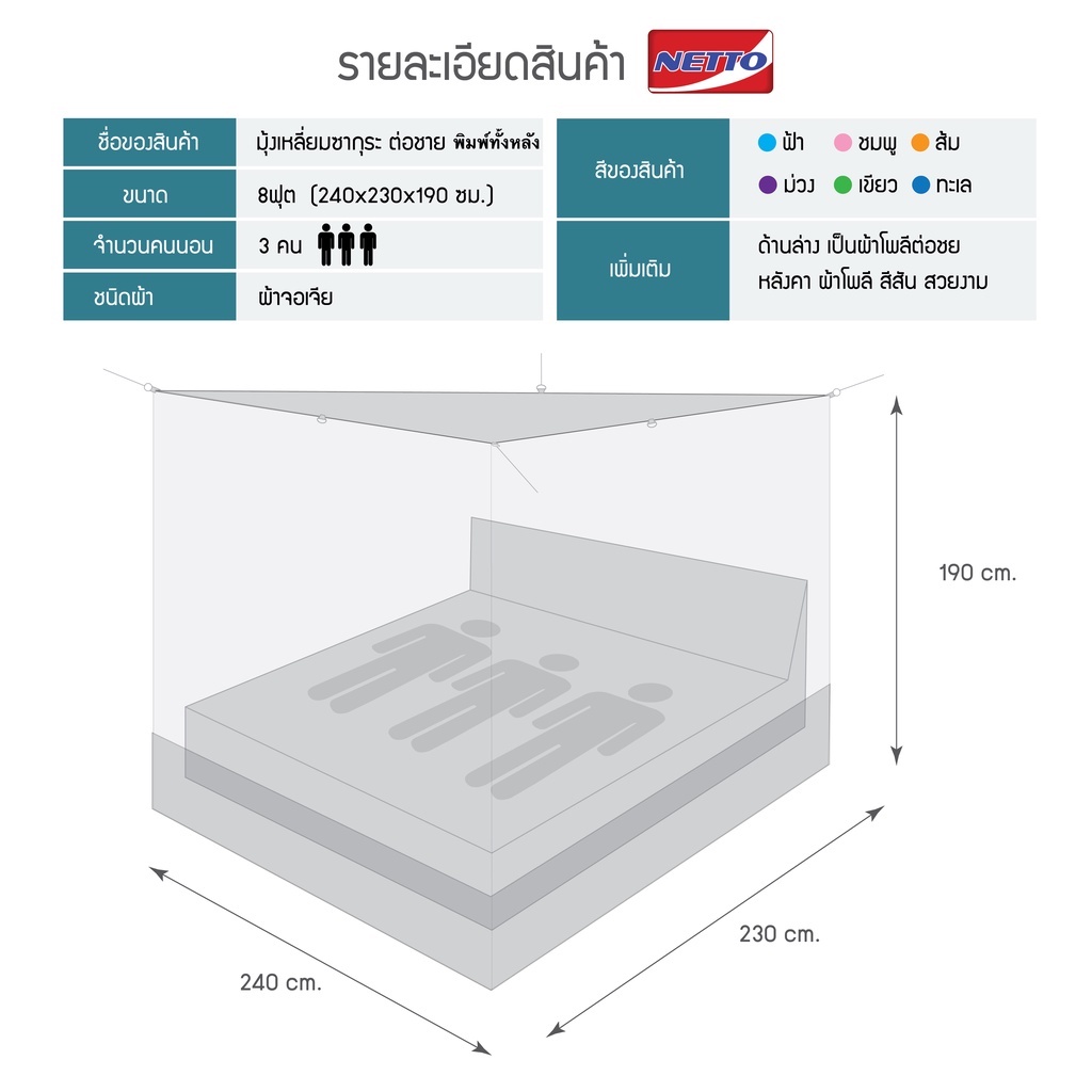 มุ้งเหลี่ยม 8 ฟุต ซากุระ พิมพ์ลายทั้งหลัง หลังคาโพลีและต่อชายโพลี ช่วยป้องกันยุงกันแมลงรอบทิศทาง หมดปัญหาชายมุ้งปลิวทำให้ยุงเข้ามุ้ง ด้วยผ้าโพลีเอสเตอร์ต่อชายทำให้มีน้ำหนักไม่ปลิวลม และหลังคาผ้าโพลีเอสเตอร์พิมพ์ลายสีสันลวดลายสวยงาม ช่
