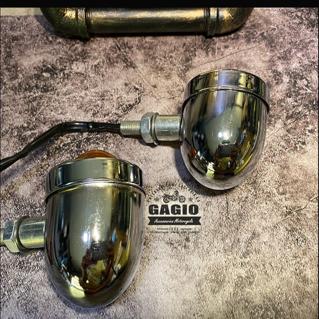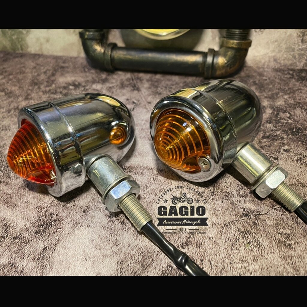 ไฟเลี้ยวแต่งลายก้นหอย สีโครเมี่ยม ฝาส้ม สำหรับมอเตอร์ไซค์สไตล์ วินเทจ คลาสสิค คาเฟ่ เรโทร บอบเบอร์ HD อื่นๆ ใช้ไฟมาตรฐาน 12V กินไฟน้อย โดยวัสดุจะเป็นโลหะผสม แข็งแรง ทนทาน สามารถเปลี่ยนใส่หลอด LED ได้