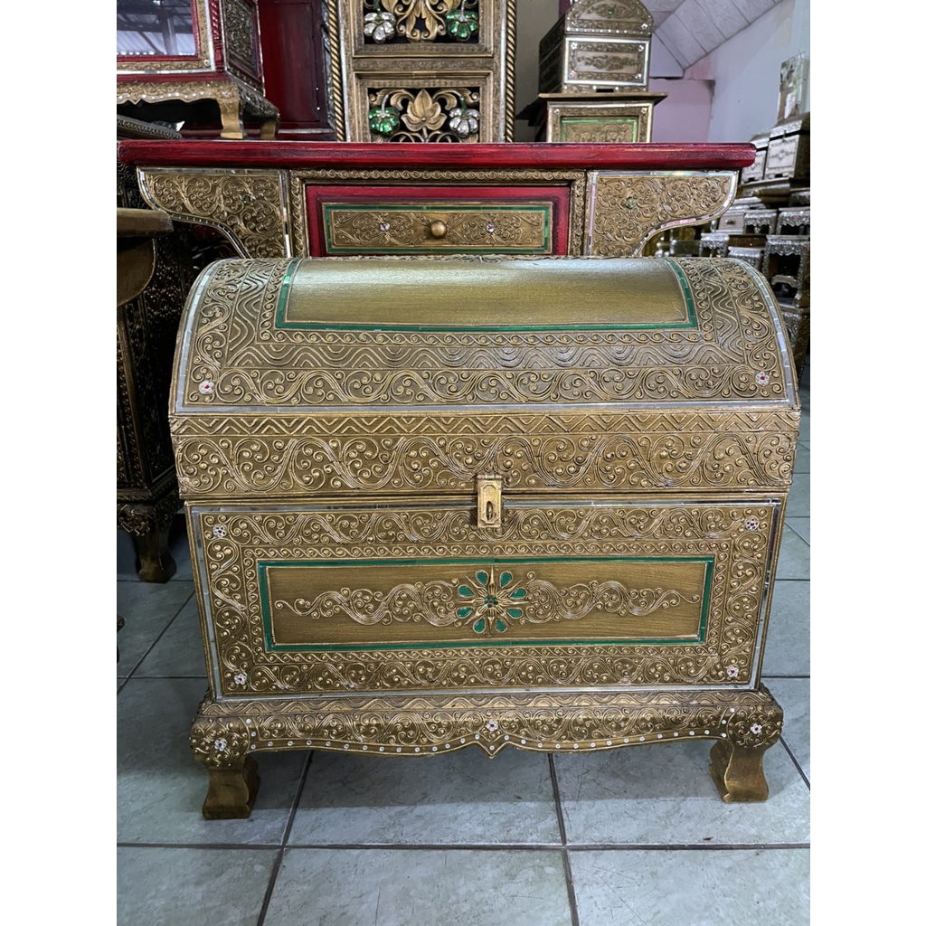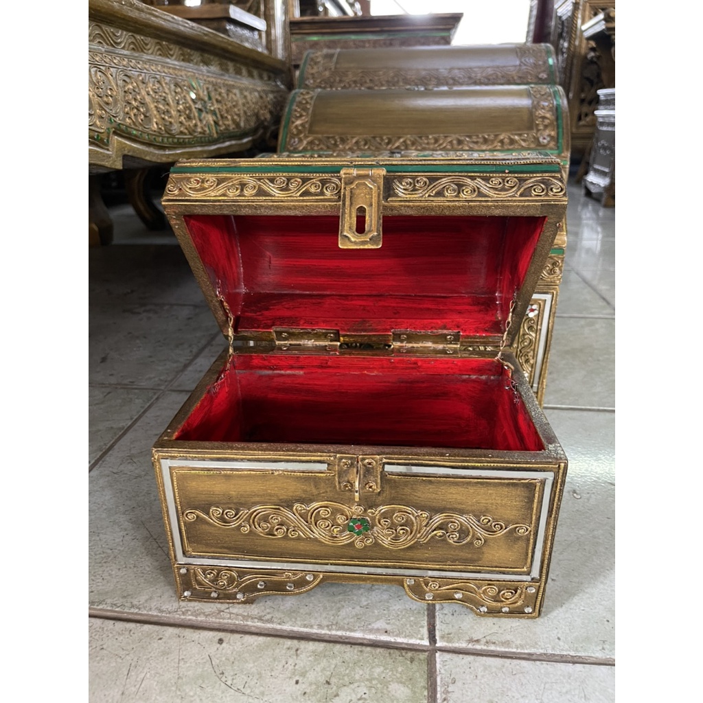 หีบไม้ หีบสมบัติ ฝาโค้ง 3 ขนาด กล่องไม้ กำปั่น ทรงหีบสมบัติฟาโรห์ หีบใส่ของ หีบใส่เงิน ใส่เครื่องประดับ เดินเส้นประดับกระจกสี ทำแบบทองเก่าโบราณ เรียกทรัพย์