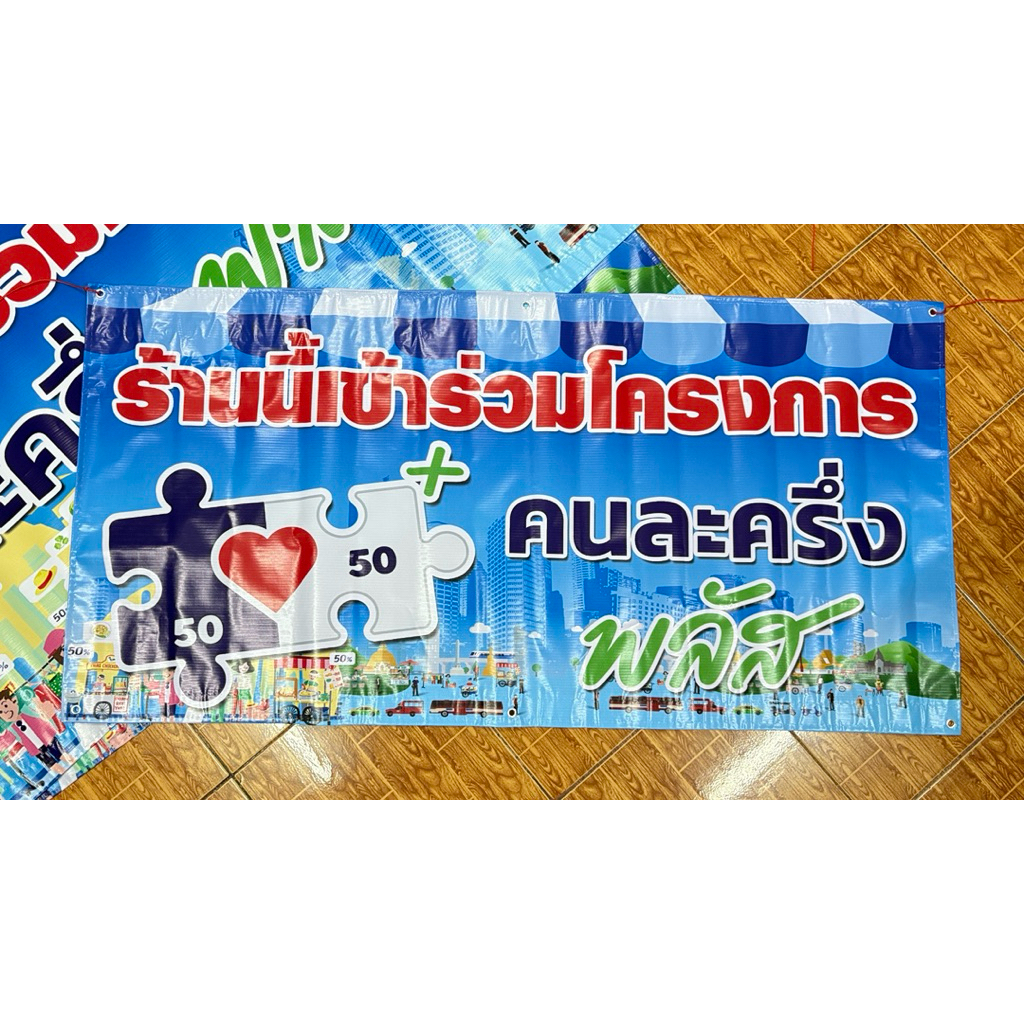 ป้ายไวนิล คนละครึ่งพลัส แถมเชือกฟรี!! พร้อมใช้งาน!!