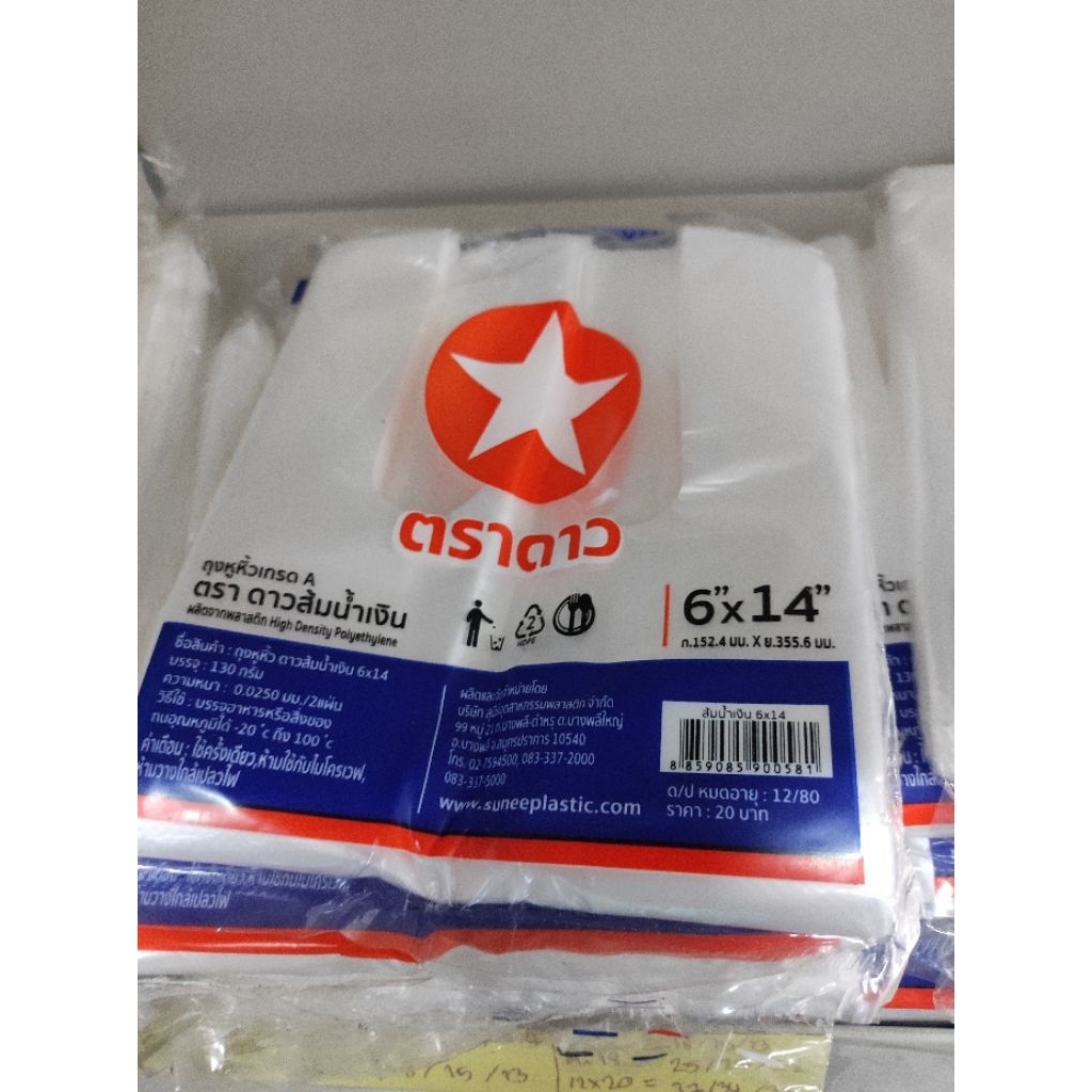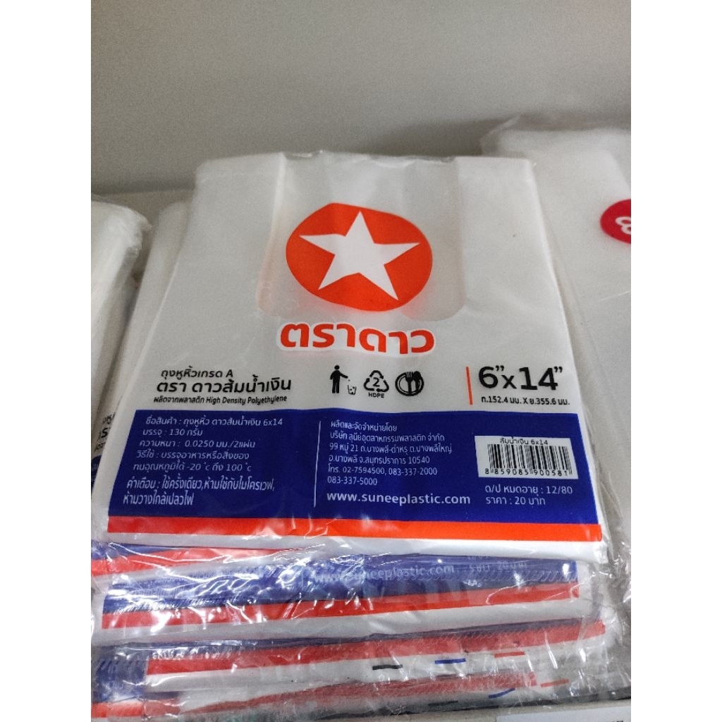ถุงหิ้วตราดาวเกรดเอ 6*14 ส้มน้ำเงิน ขายส่ง 1 มัด มี 10 แพ็ค