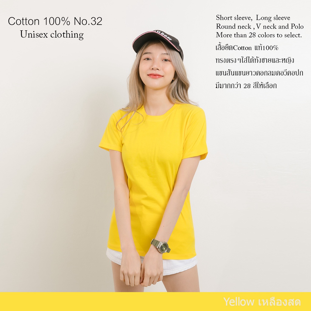 หยิบใส่ตะกร้าcotton.th เสื้อยืด [สีเหลือง] คอกลม-คอวีแขนสั้น cottonแท้100% No. 32 เสื้อยืดแขนสัน