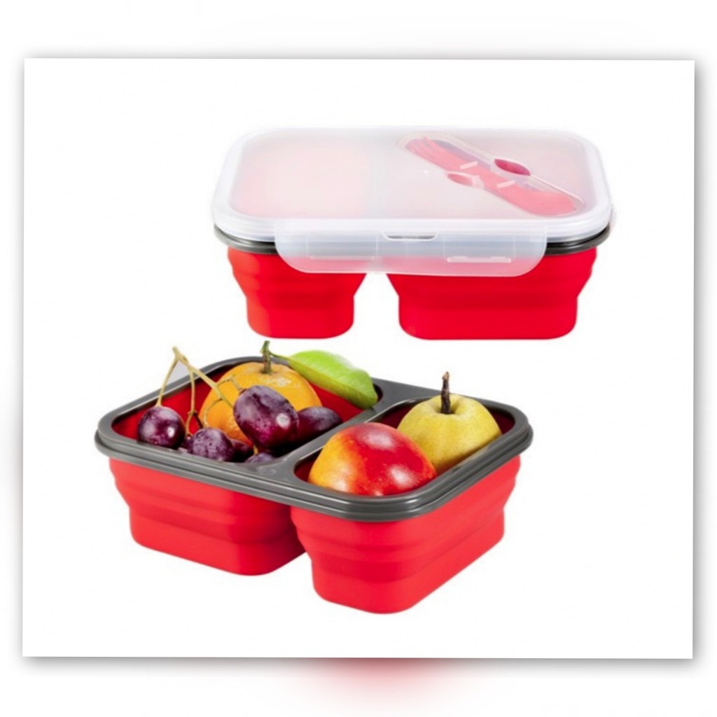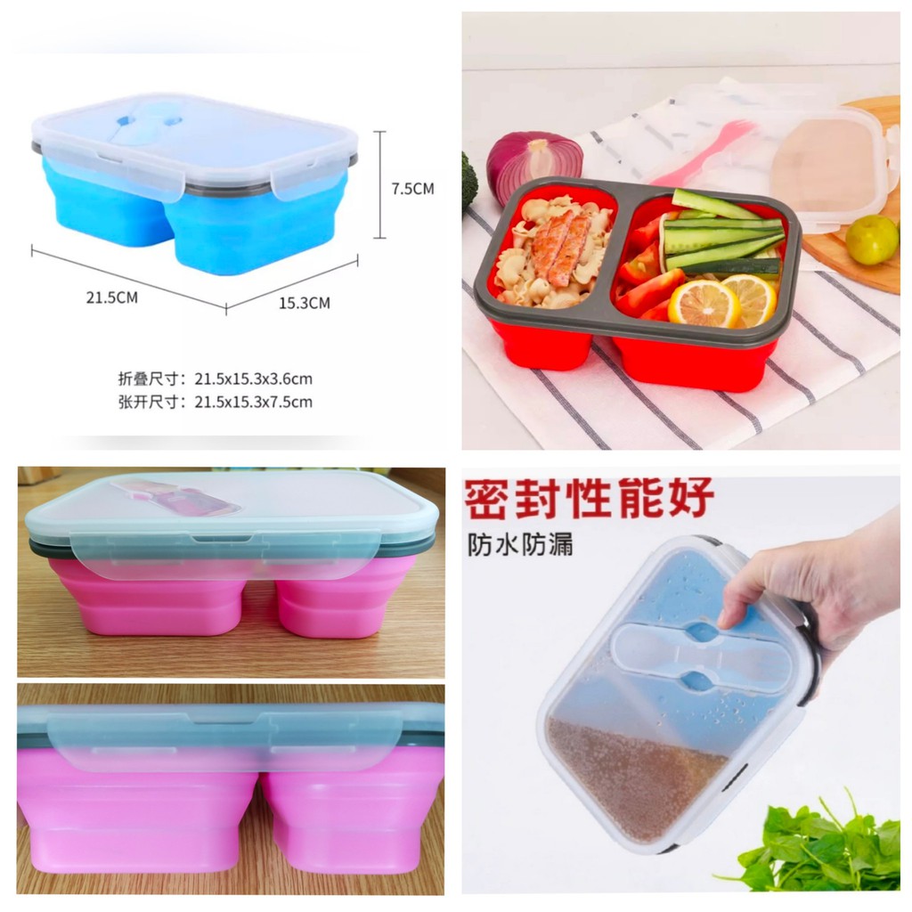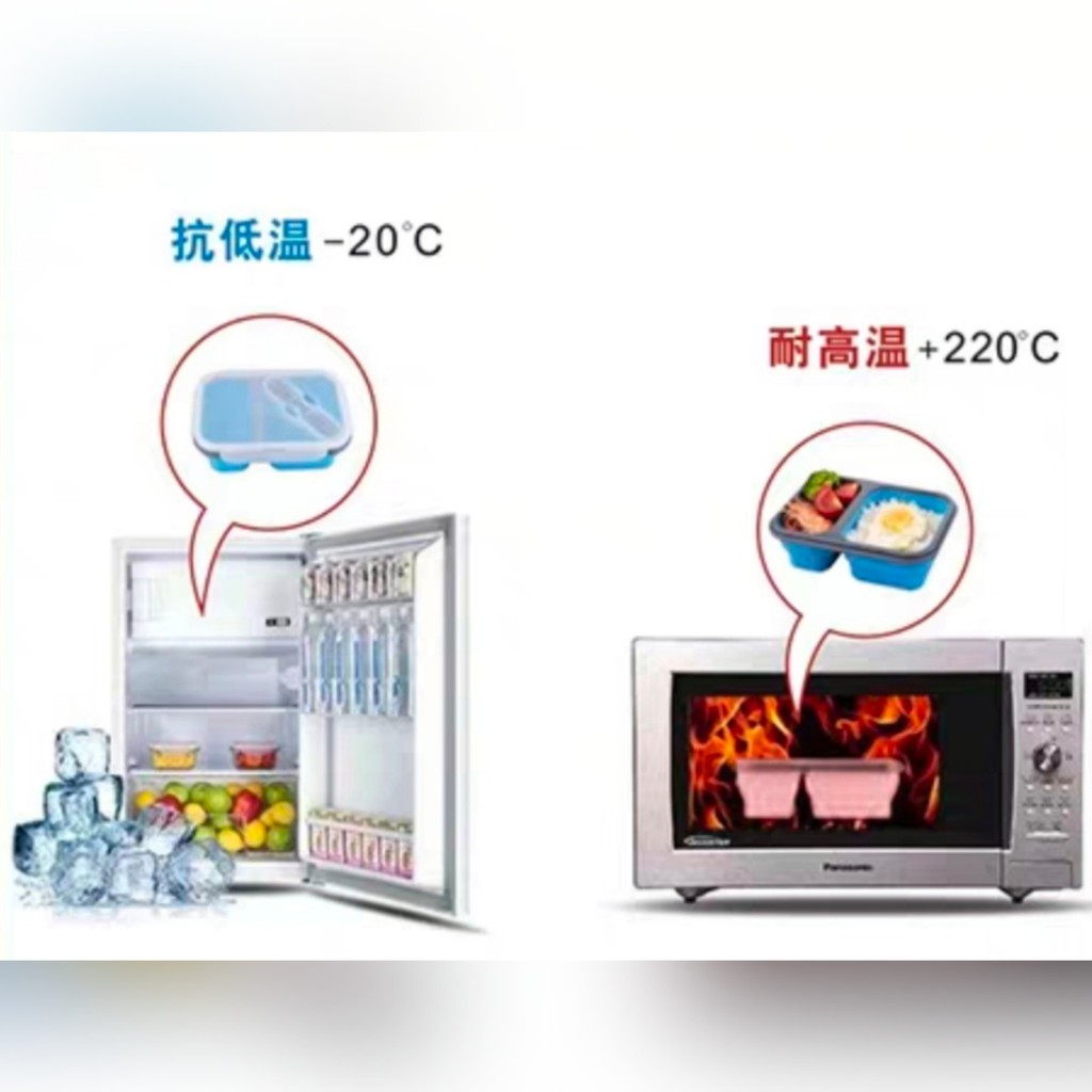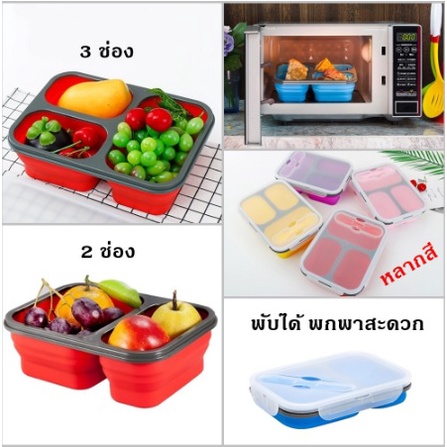 😊กล่องข้าวซิลิโคนพับได้ 2ช่อง แช่ตู้เย็นและเข้าไมโครเวฟได้