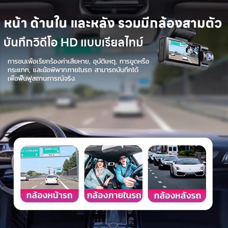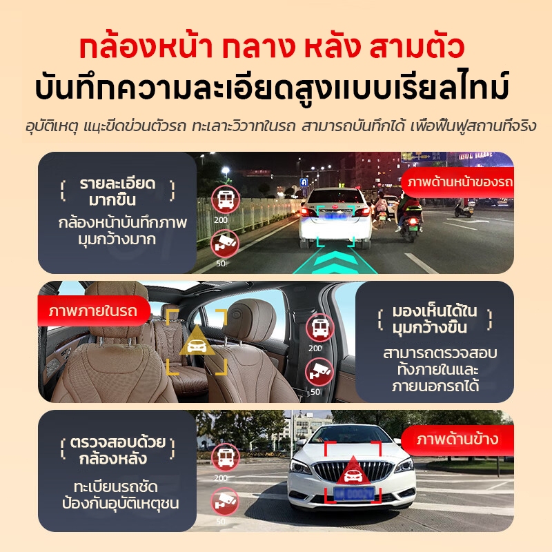 กล้องติดหน้ารถ Car Camera 3กล้อง ด้านหน้า + ภายใน + ด้านหลัง เมนูภาษาไทย รับประกันศูนย์ไทย1ปี wifi กล้องติดรถยนต์อัฉริยะ