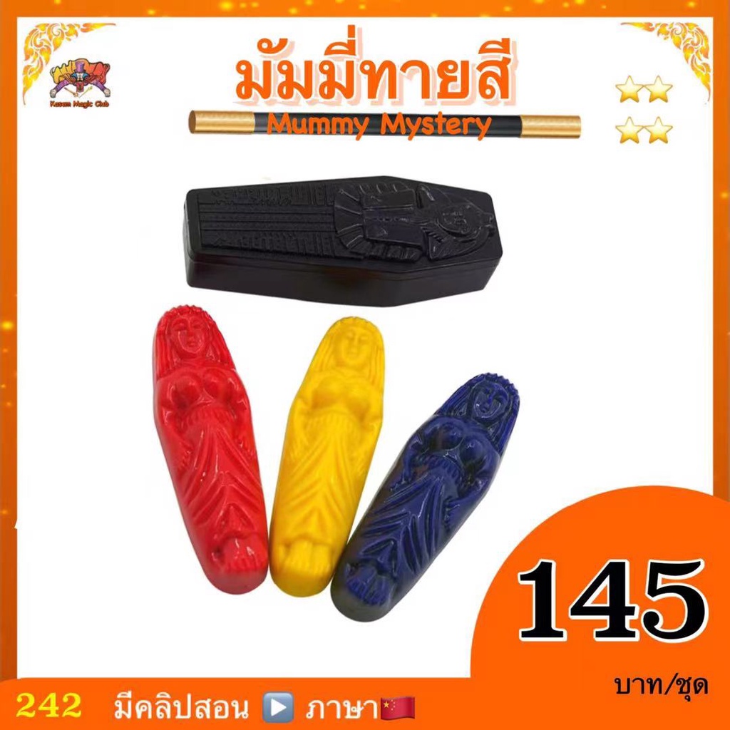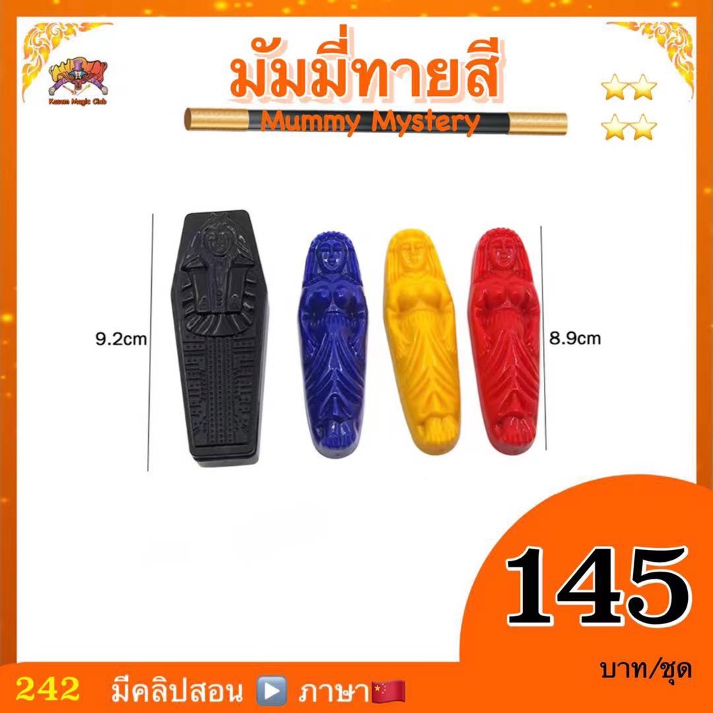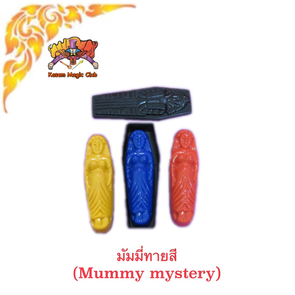 การแสดง : นักแสดงมายากล ให้คนดูเลือกมัมมี่ แล้ว ใส่ ลงใน โรงศพ ปิดฝา โดยที่ นักแสดง มายากล มองไม่เห็นนะคะ สีที่ให้คนดูถือไว้ ไม่ให้นักแสดงมายากลเห็น เช่นกัน จากนั้น นักแสดง สามารถ มองทะลุผ่านกล่อง โรงศพ ก็ทายได้ว่า เลือกสีใด โดยไม่แตะ