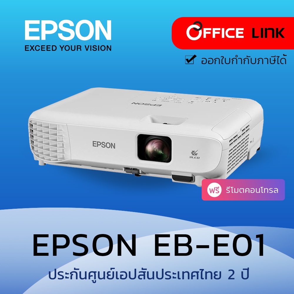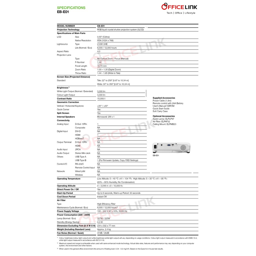 EPSON รุ่น EB-E01 (3,300 lm / XGA) ความสว่าง(ANSI Lumens) 3,300 ความละเอียด(พิกเซล)1024×768(XGA) Contrast 15,000:1 Brand EPSON Projector Technology 3LCD Brightness 3,300 Contrast Ratio 15,000:1 Resolution 1024×768(XGA) Aspect Ratio 4:3 Keystone Correction