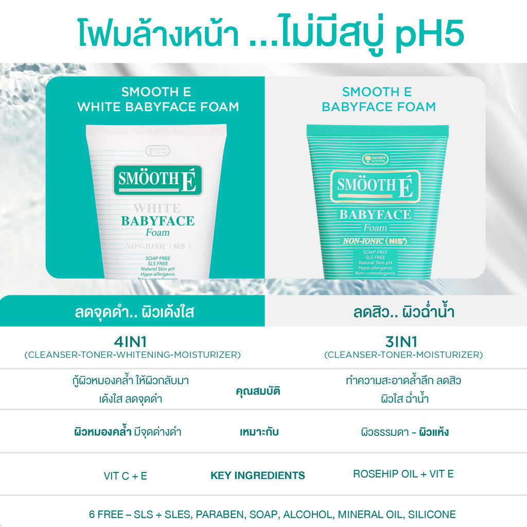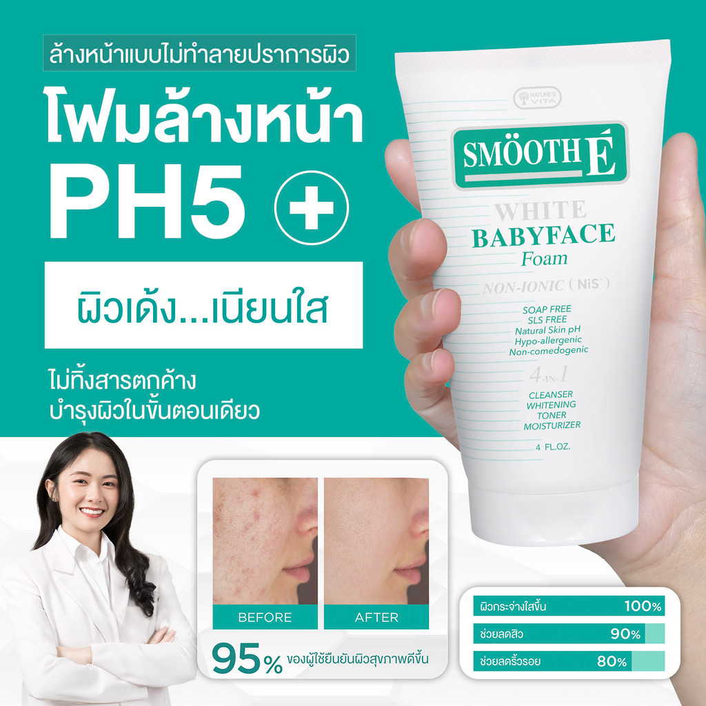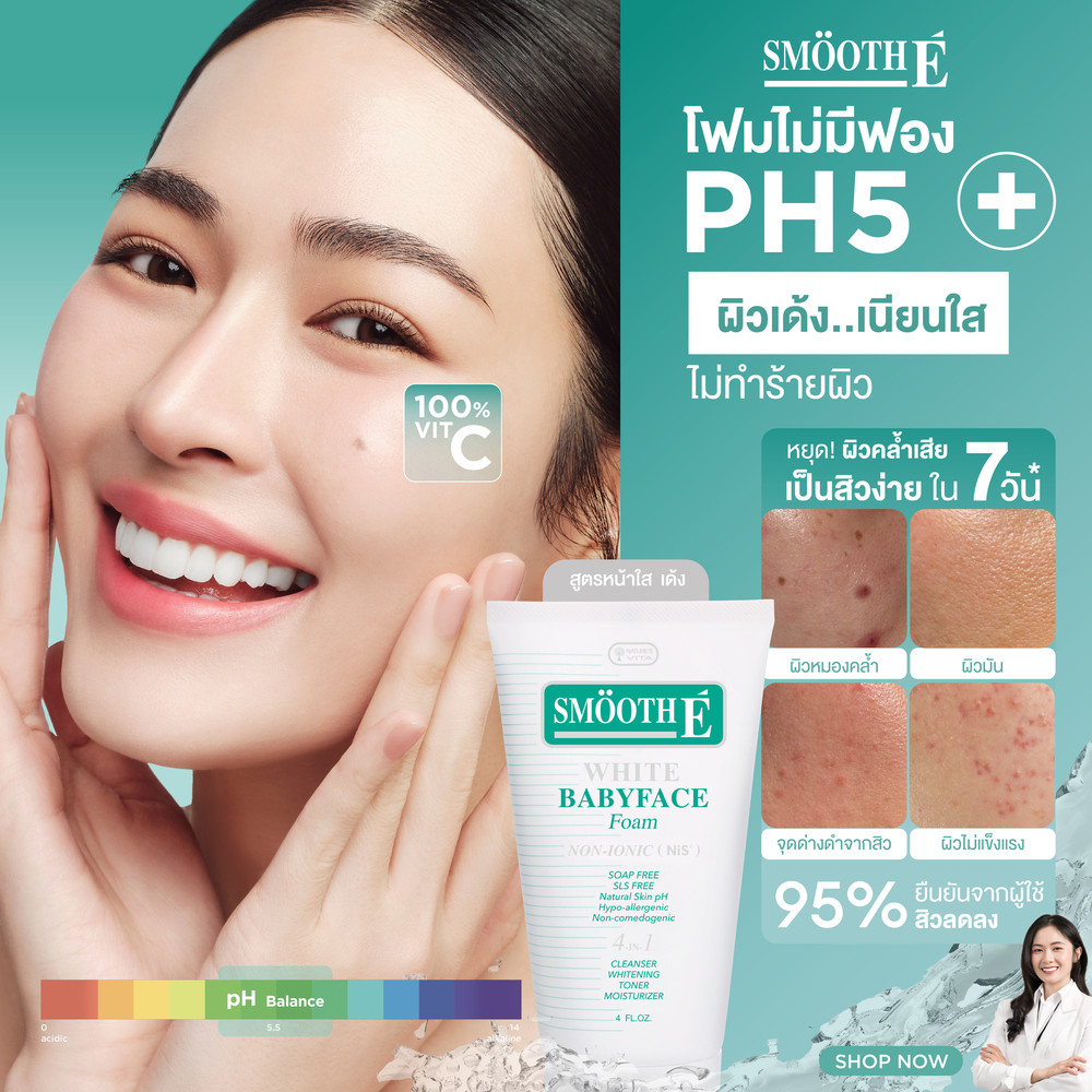 Smooth E White Babyface Foam โฟมล้างหน้าเพื่อผิวขาวอ่อนเยาว์ มีส่วนผสมของ Melawhite ช่วยยับยั้งการสร้างเม็ดสีที่ผิดปกติ ช่วยให้ผิวหน้าขาวใส ต่อต้านความหมองคล้ำ ฝ้ากระ จุดด่างดำ