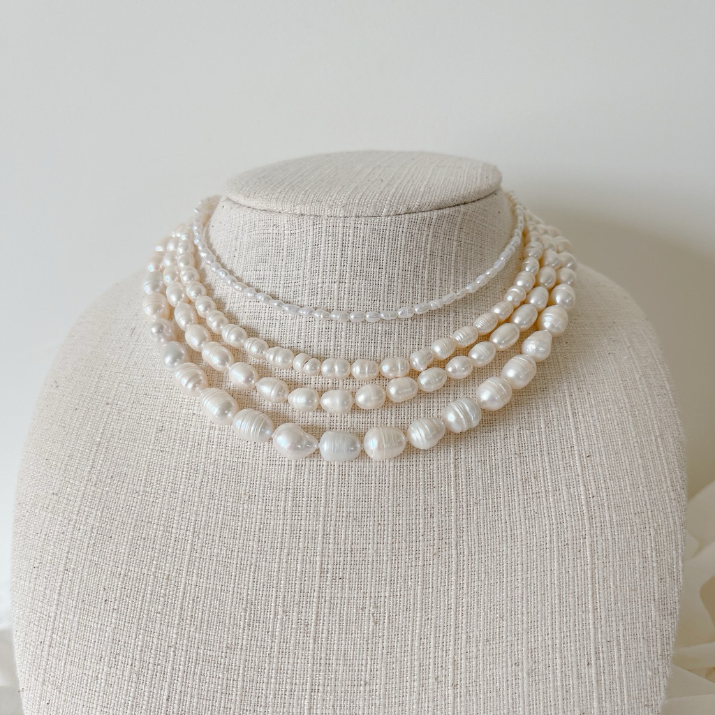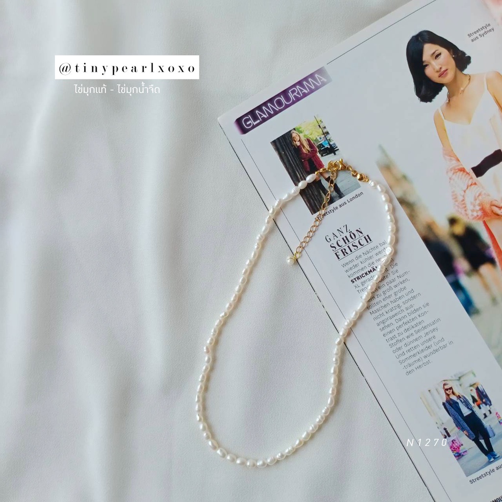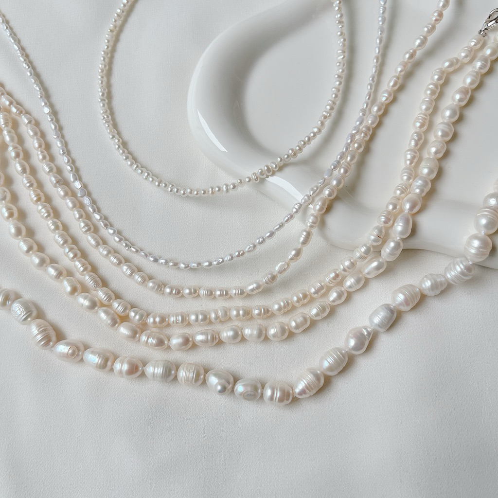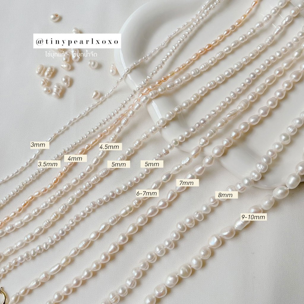 สร้อยคอไข่มุกแท้ ขนาด 4-6mm เป็นไข่มุกขนาดกลางๆ ทรงรี-ทรงไข่ (Oval) สีขาว-ครีม และไข่มุกสีพีช ไข่มุกน้ำจืด มีริ้วรอยบ้างเล็กน้อยตามธรรมชาติ