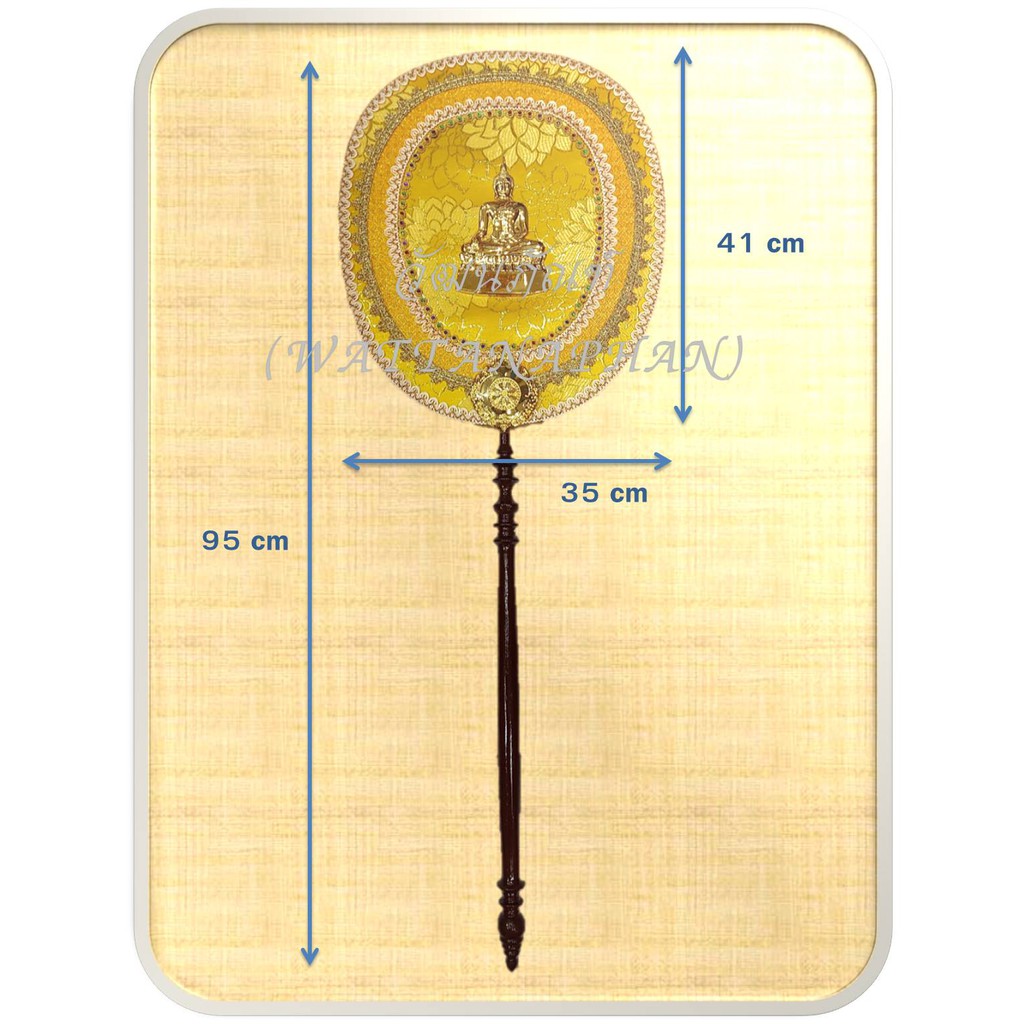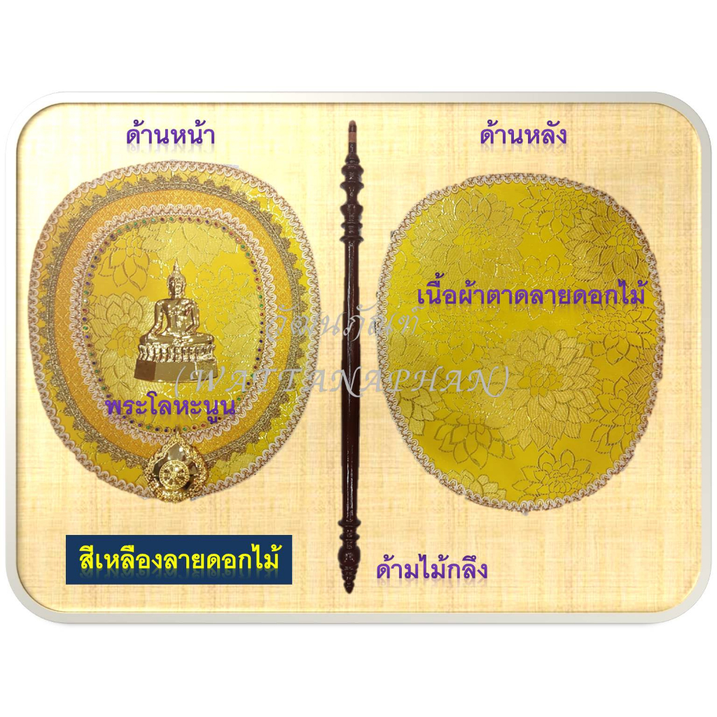 ตาลปัตร ตาลปัตรประดิษฐ์ผ้าตาดทองลายดอกไม้ พระโลหะนูน ด้ามไม้กลึง สวยงาม