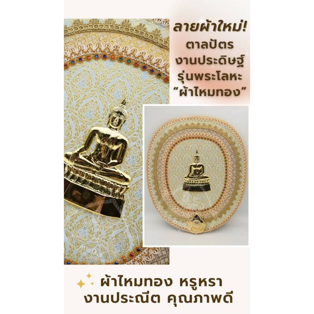 หยิบใส่ตะกร้าตาลปัตร ตาลปัตรประดิษฐ์ผ้าตาดทองลายดอกไม้ พระโลหะนูน ด้ามไม้กลึง สวยงาม