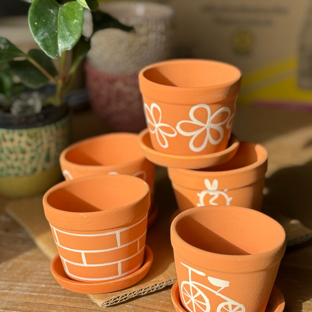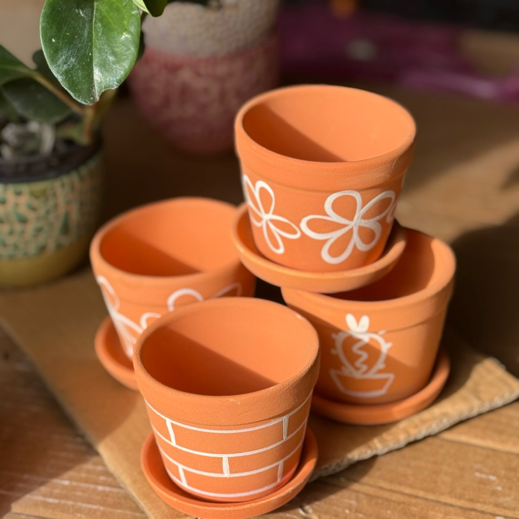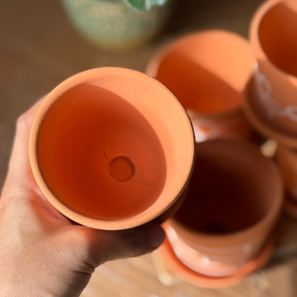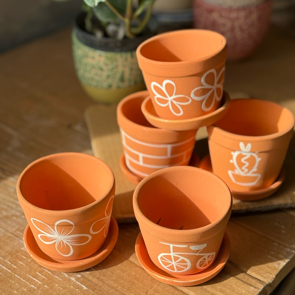 กระถางดินเผา กว้าง 3 นิ้ว สีดินแดง พร้อมจานรอง