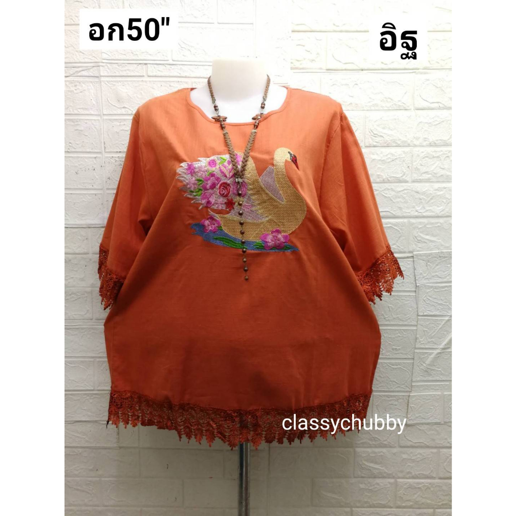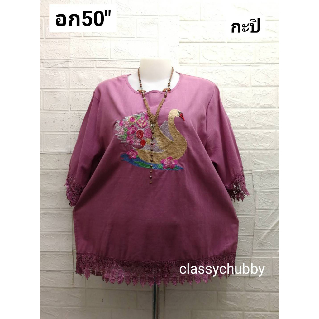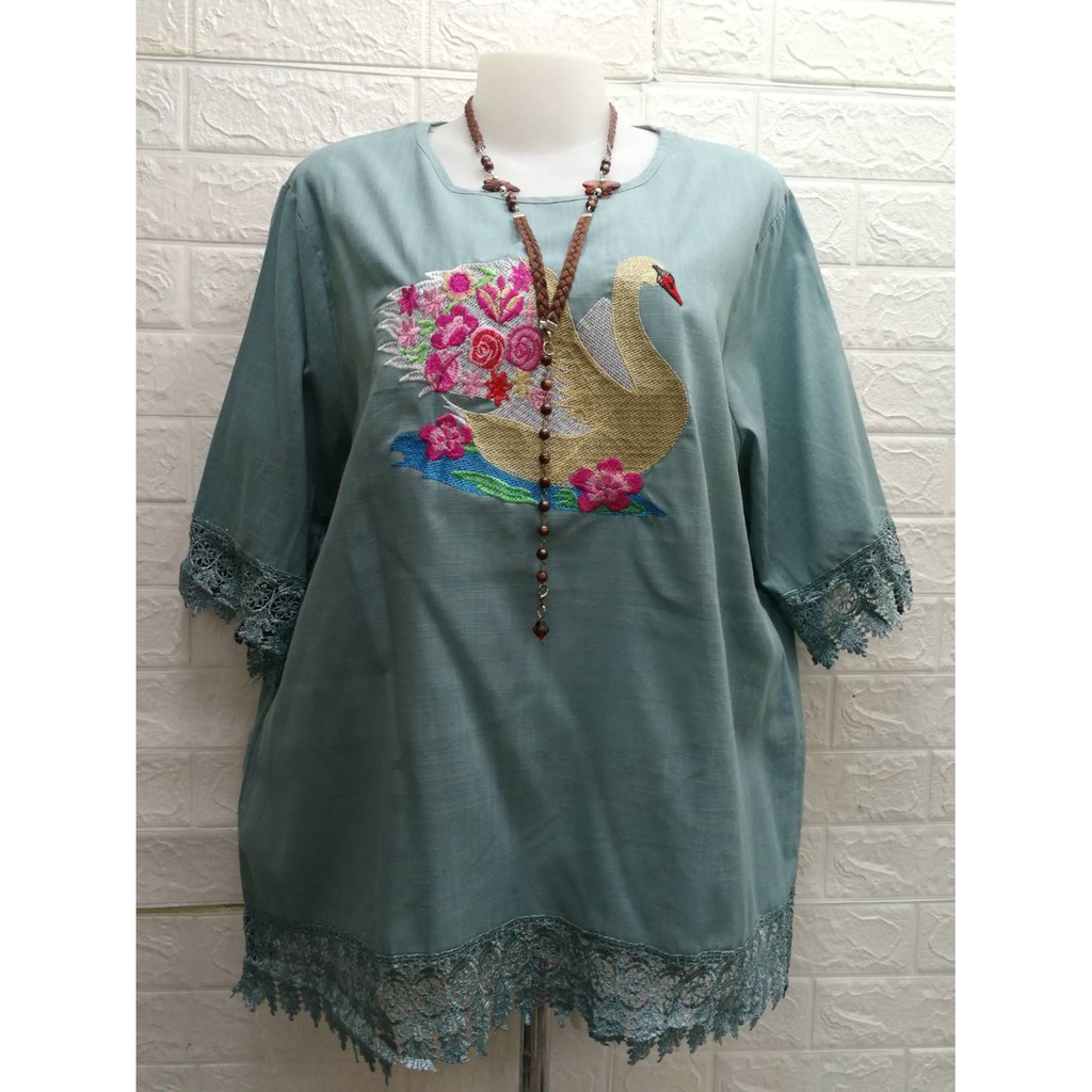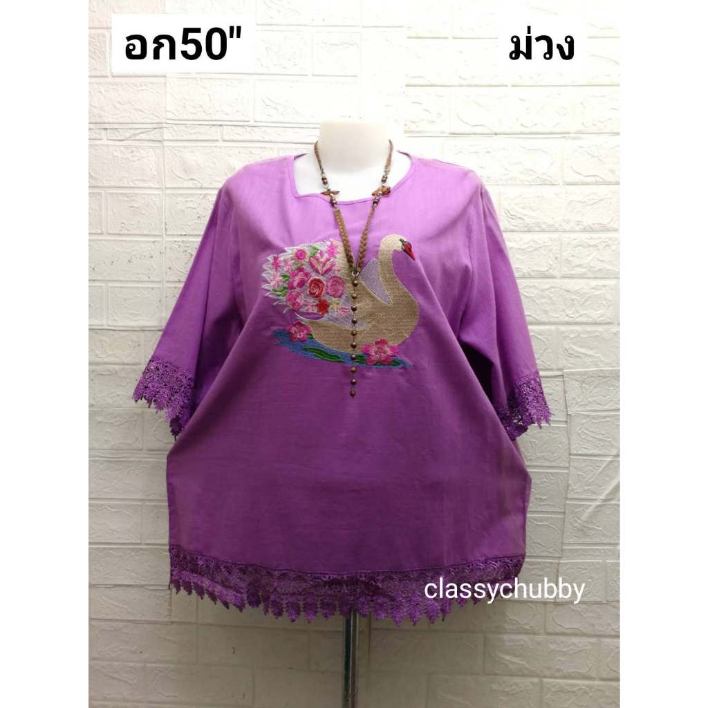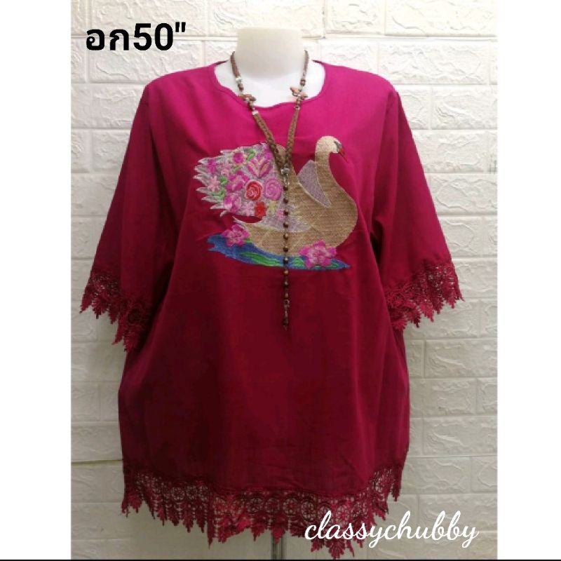 เสื้อสาวอวบ คอกลมอก50″ปักลายหงษ์แน่นสวยเก๋ แขน3ส่วนแต่งลูกไม้ชายและแขน ใส่เที่ยววันแม่