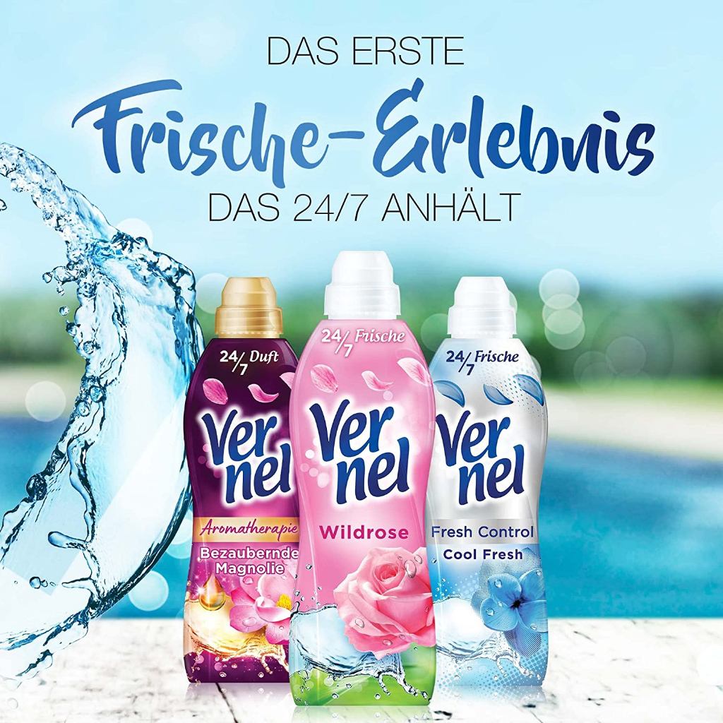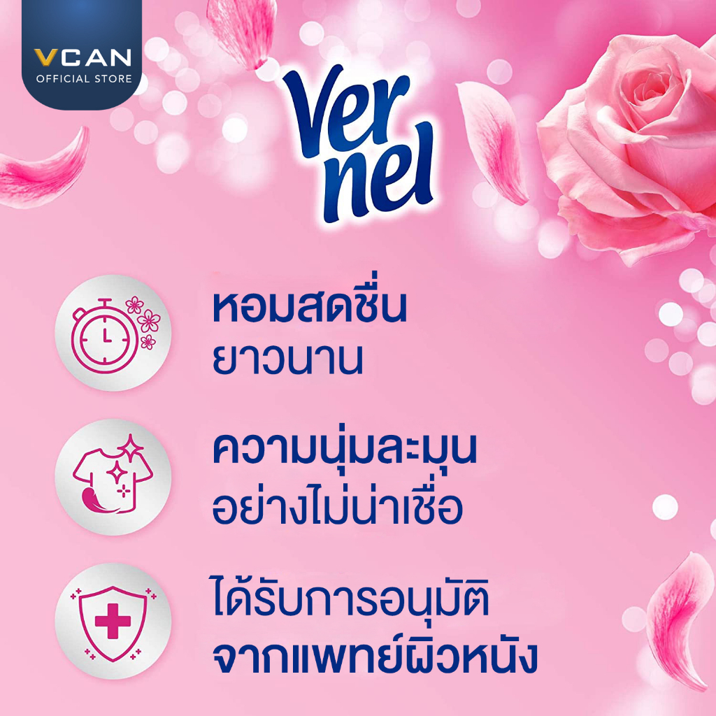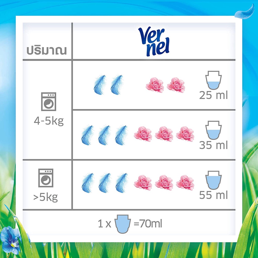 – ใช้เวอร์แนลเพียง 1/2 ฝาสำหรับผ้าประมาณ 4-5 กิโลกรัม ในน้ำสุดท้ายของการซัก