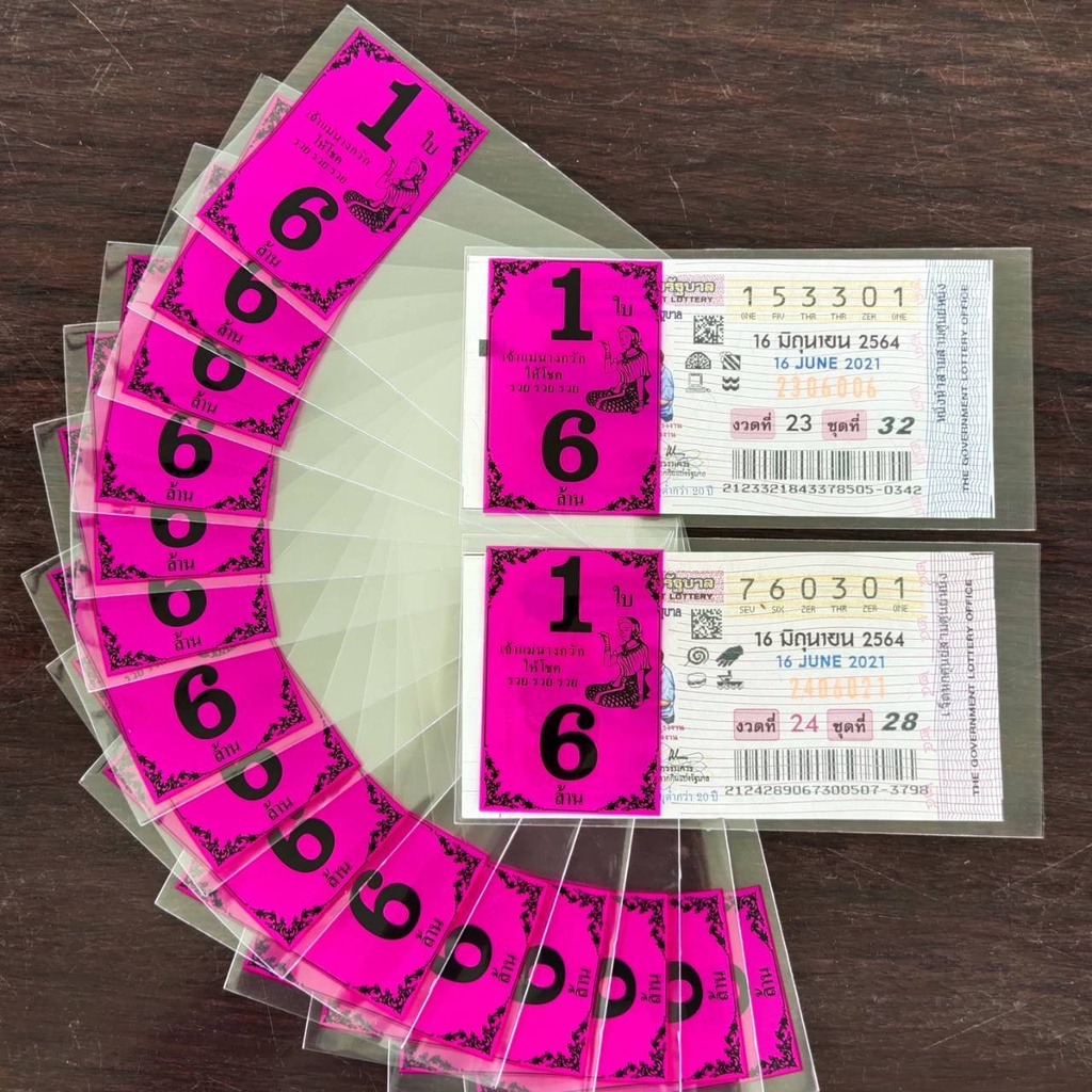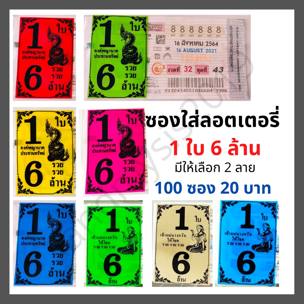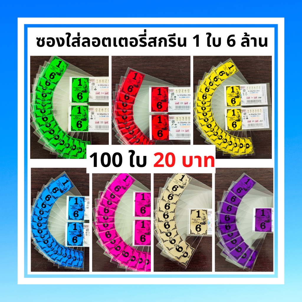 ซองแก้วใส สกรีน1ใบ6ล้าน ซองใสใส่ลอตเตอรี่ มี 6สี ซองแก้วใสใส่ลอตเตอรี่1แพค 20 บาทได้100ซอง สำหรับใส่สลากกินแบ่งรัฐบาล