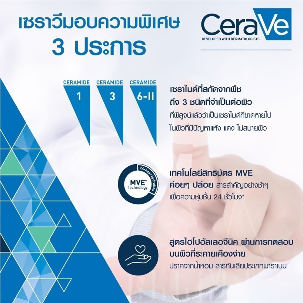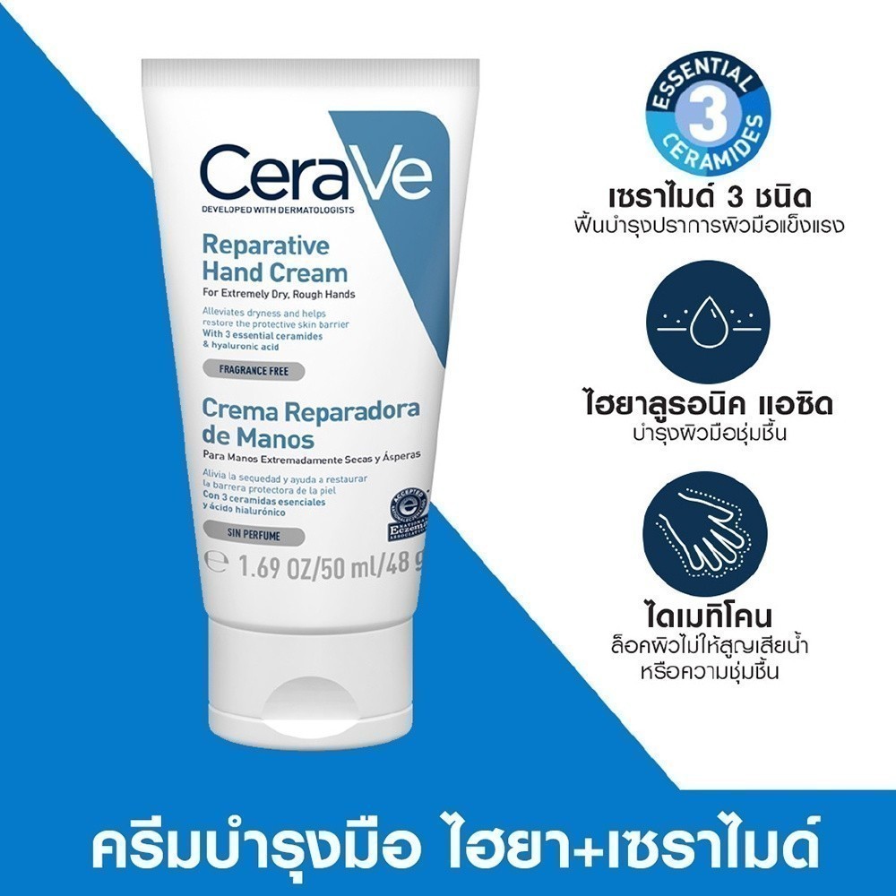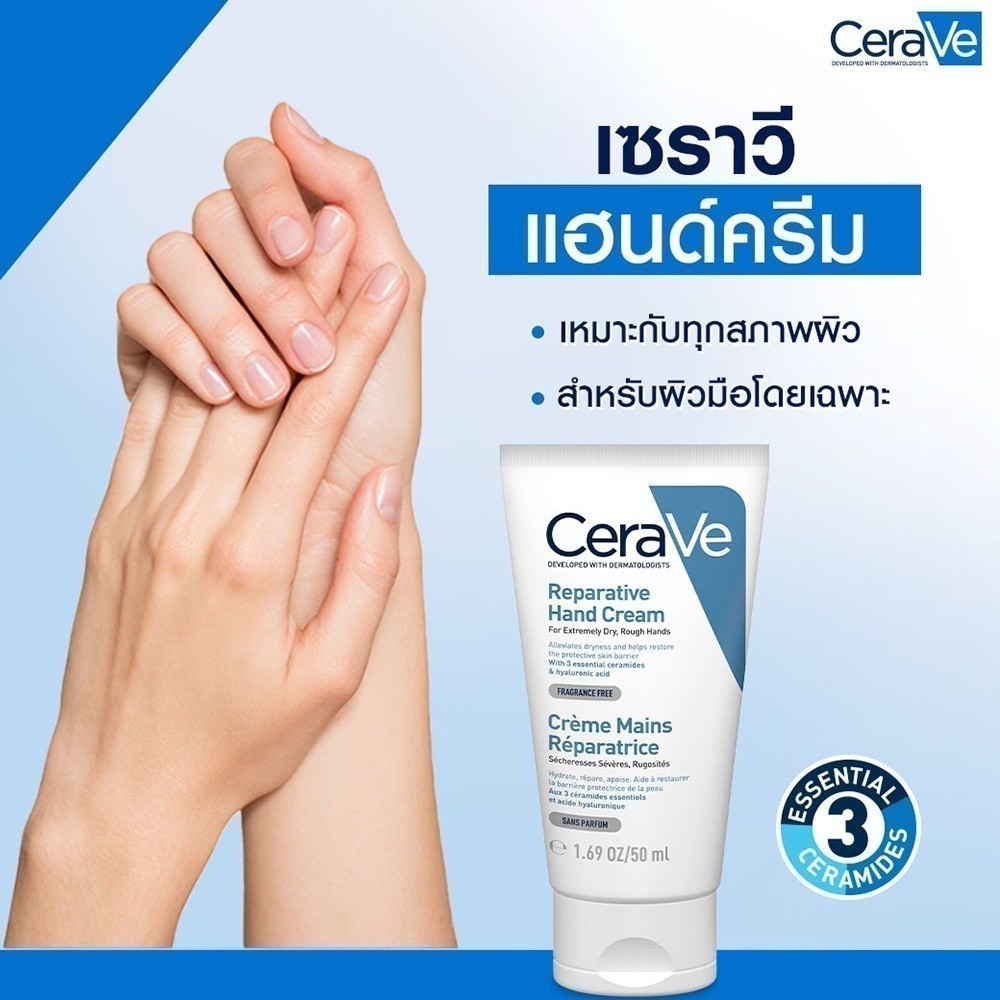 เซราวี แฮมด์ ครีม พัฒนาร่วมกับแพทย์ผิวหนัง ช่วยเติมความชุ่มชื้นให้กับผิวมือที่ดูแห้งกร้านและฟื้นบำรุงปราการผิวให้ดูชุ่มชื้นสุขภาพดี เนื้อผลิตภัณฑ์เข้มข้น แต่ไม่ทิ้งความมันและความเหนอะหนะ บำรุงมือที่แห้งลอก* กลับมาชุ่มชื้นด้วยส่วนผสมต่างๆ ได้แก่ นวัตกรรมเต