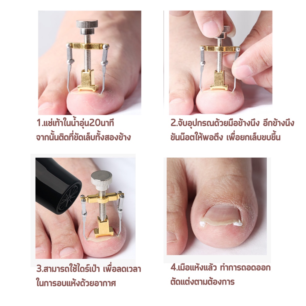 หลังจากนั้นขันน๊อตให้พอตึง เพื่อยกเล็บขบขึ้น แล้วแช่น้ำอุ่นซักพักให้เล็บนิ่มลงและคลายตัว หลังจากนั้นตัดแต่งตามต้องการ