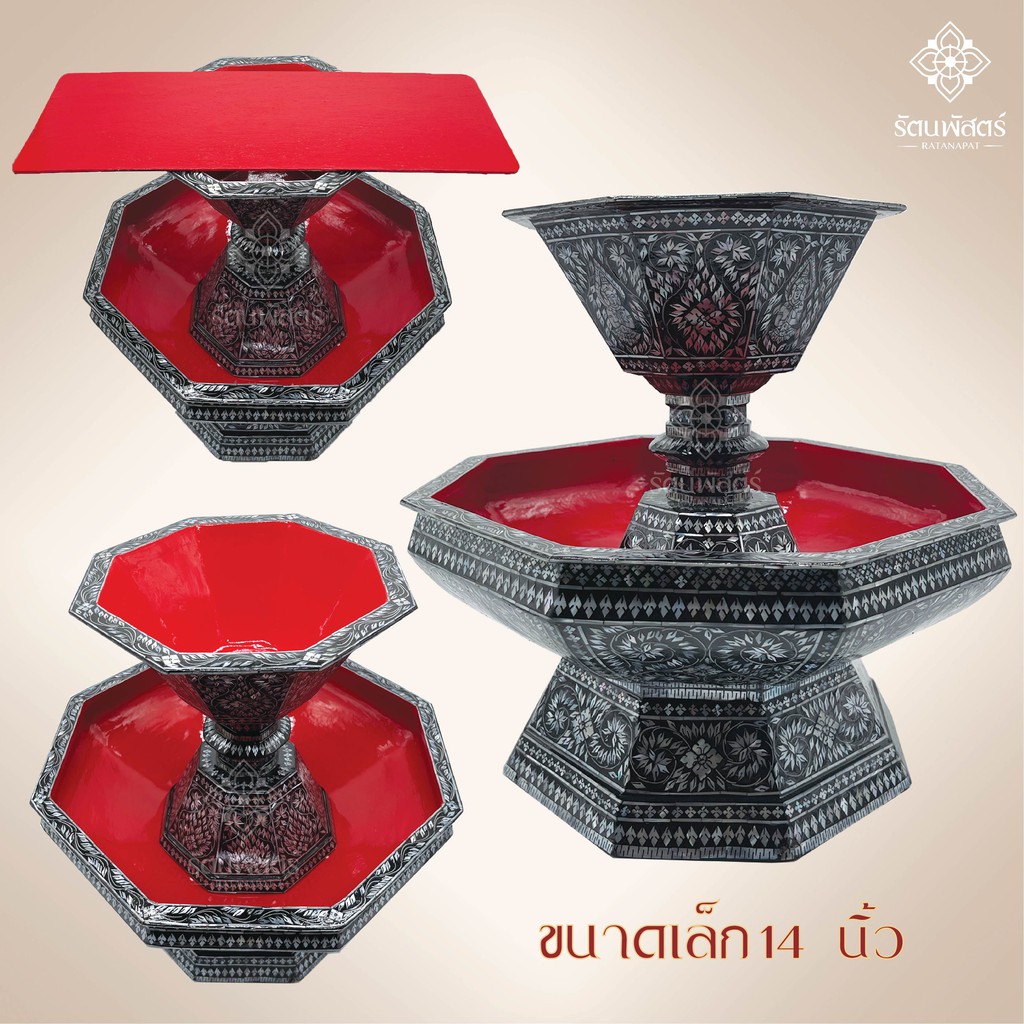 ผลิตจากไม้ ภายนอกประดับเปลือกหอยมุก ภายในทาสีแดงพร้อมเคลือบแชล็ค